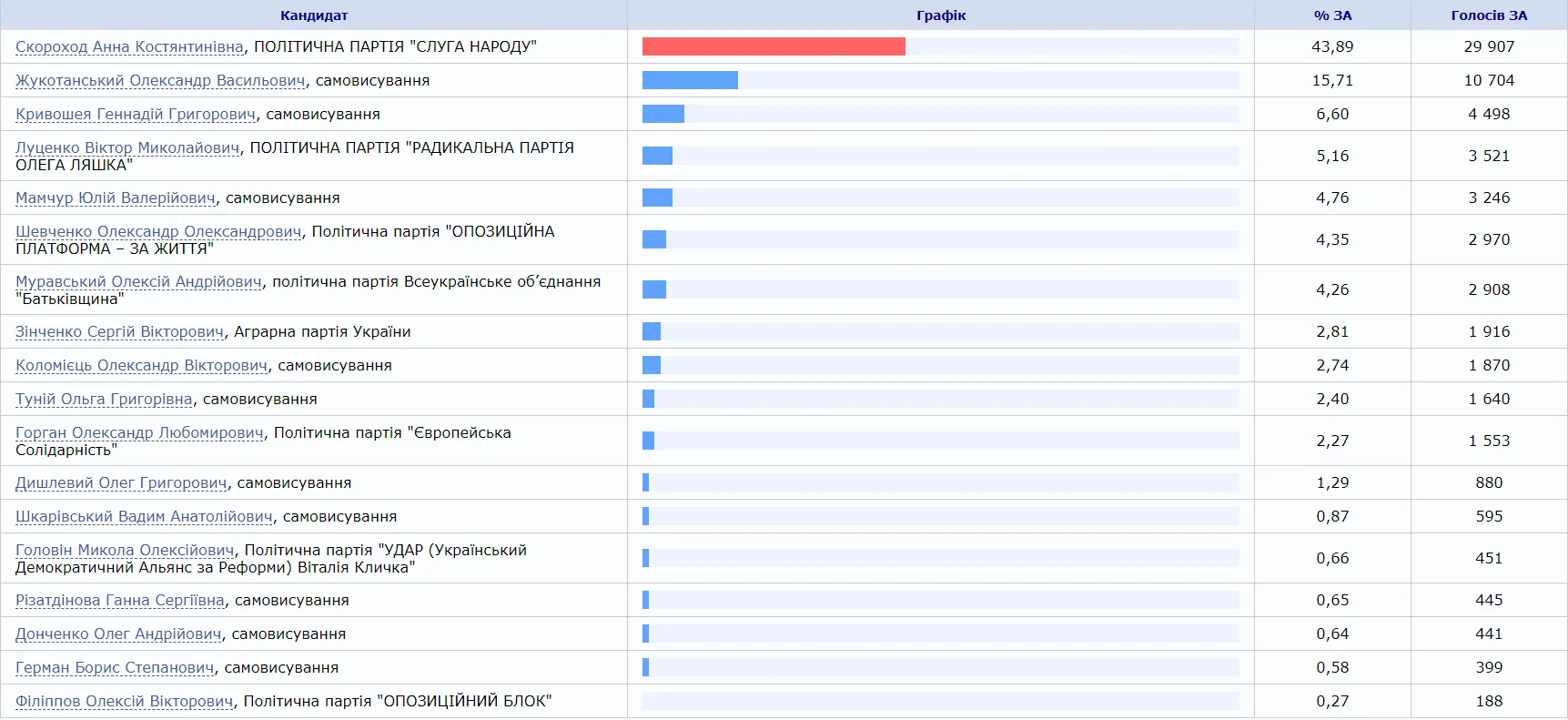 Анна Скороход перемогла на окрузі із великим відривом – 43,89%, за неї проголосували 29 907 виборців. Її найближчий опонент Олександр Жукотанський набрав 15%, а відомий військовий льотчик Юлій Мамчур – 4,76%.