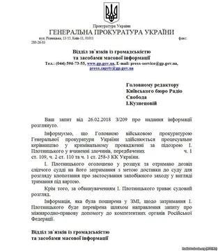 "Інформація, яка була розповсюджена у ЗМІ щодо затримання Плотницького, буде перевірена шляхом направлення запиту про міжнародно-правову допомогу компетентним органам Російської Федерації", – йдеться у відповіді ГПУ.