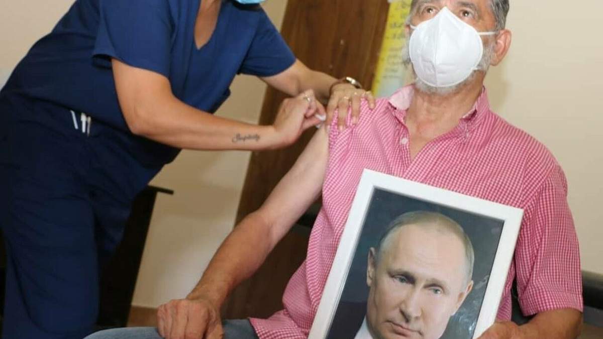 Відповідне фото мер провінційного містечка опублікував у своєму твітері. На ньому видно: під час того, як медик вколює йому в руку шприц, він тримає портет Путіна.