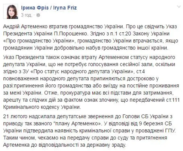 "Указ Президента також означає втрату Артеменком статусу народного депутата України, що не потребує голосування сесійної зали, оскільки згідно з Законом України "Про статус народного депутата України", повноваження народного депутата припиняються достроково у разі: припинення його громадянства або виїзду на постійне проживання за межі України", – зазначила вона.