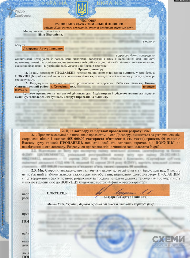 - Син ексголови СБУ Івана Баканова Артур Лазаренко, придбав земельну ділянку в елітному селі Ходосівка за заниженою ціною у 2021 році.