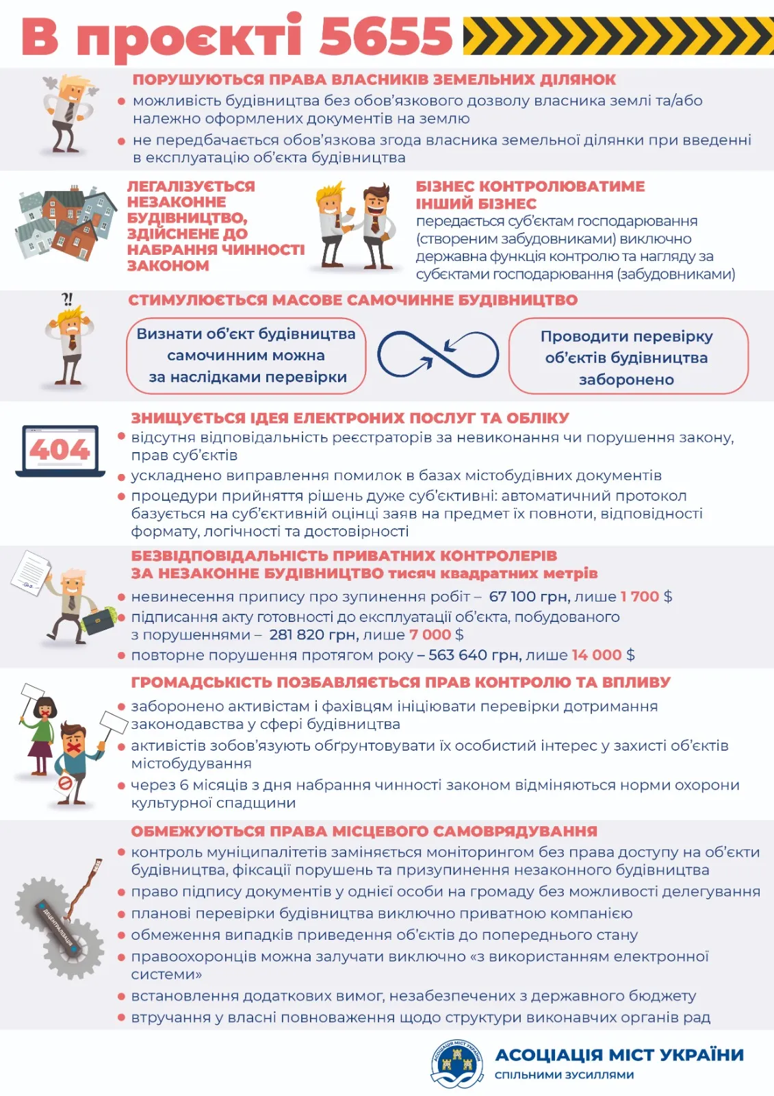 - Громадськість позбавляється прав контролю та впливу. Активістам та фахівцям заборонено ініціювати перевірки дотримання законодавства у сфері будівництва, активістів зобов’язують обґрунтувати їх особистий інтерес у захисті об’єктів містобудування.
