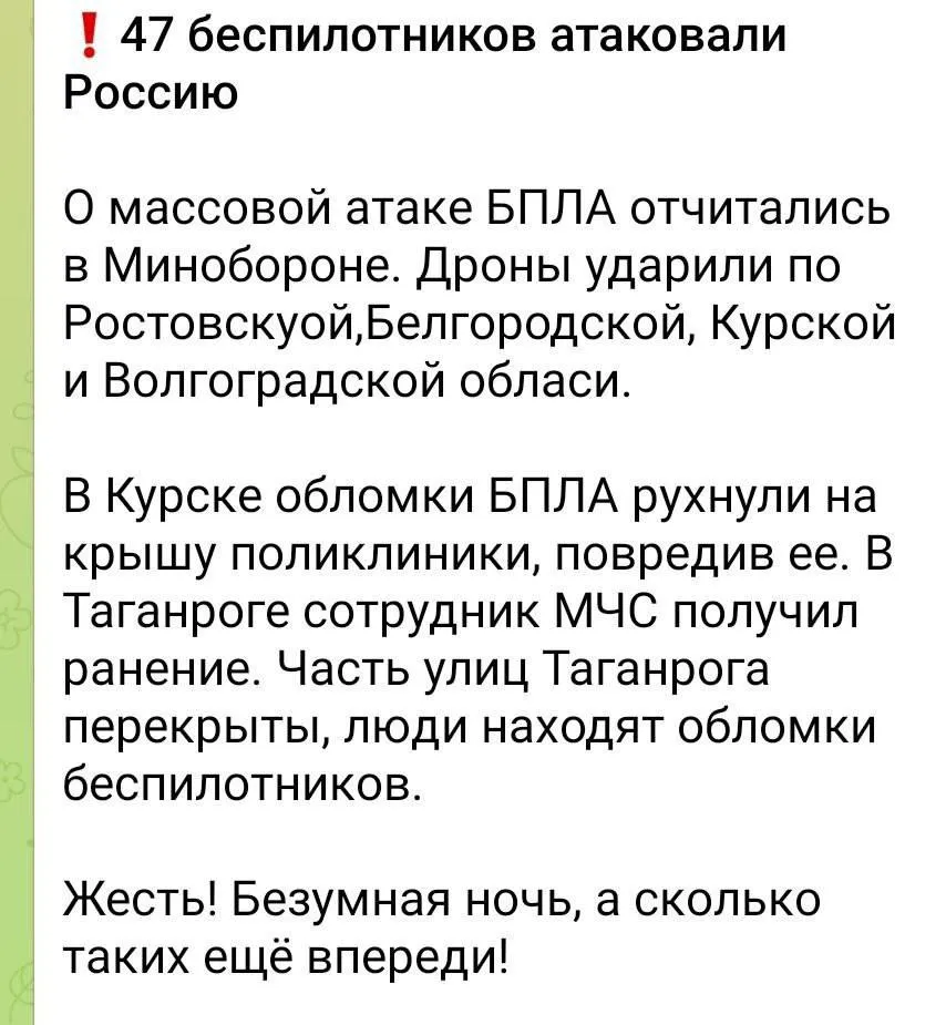 Близько 6:00 міністерство оборони Росії відзвітувало про те, що "припинено спробу київського режиму скоїти терористичну атаку із застосуванням 47 БпЛА літакового типу по об'єктах на території Російської Федерації".