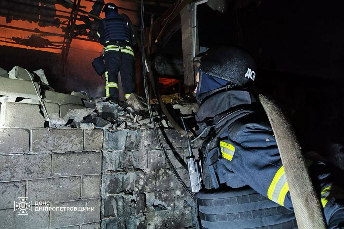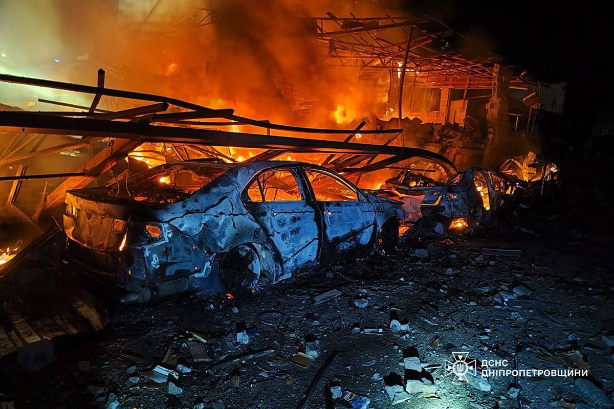 За даними ОВА, через атаку безпілотників є руйнування на території приватного підприємства у Кам'янському. Виникло дві пожежі. Пошкоджені 10 авто та газогін. Поранення отримали двоє чоловіків 39 та 48 років. Вони лікуватимуться амбулаторно.