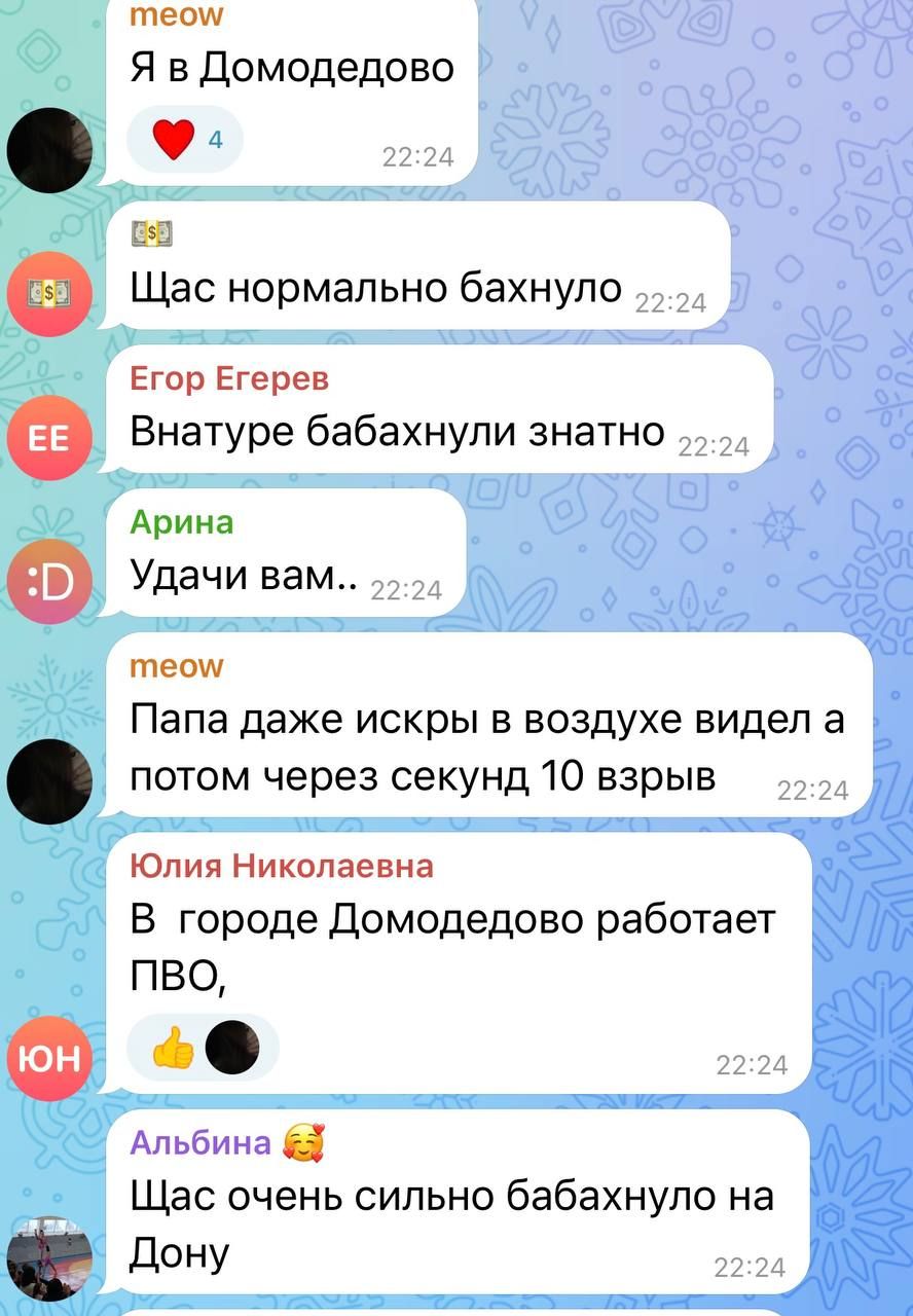 Український моніторинговий телеграм-канал "Веселий Південь" писав, що БпЛА літають на відстані 40 кілометрів від Кремля. І справді, в російських пабліках зауважили, що під атаку потрапило підмосковне Домодєдово. Місцеві помітили кілька спалахів у небі та чули "характерні звуки".