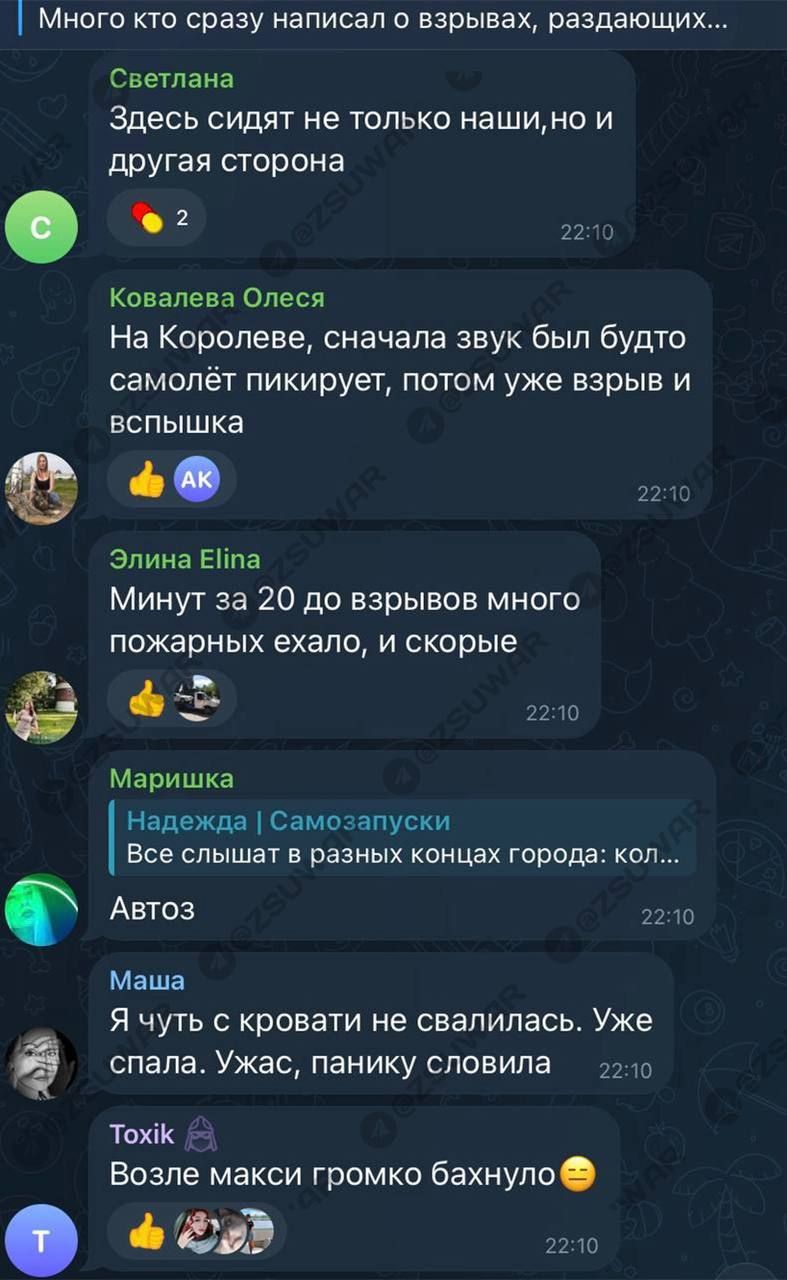 Також соцмережами ширяться скриншоти місцевих телеграм-чатів. На них можна почитати, як росіяни розповідають про спалахи та вибухи, дивні гучні звуки та тремтячі вікна. Одна жінка зізналася, що зіткнулася з панічною атакою та ледь не впала з ліжка. Інша росіянка повідомила, що приблизно за 20 хвилин до вибухів їхало чимало пожежних машин та автівок швидкої допомоги. Також місцеві жителі написали, на яких конкретно вулицях було чути звуки "бавовни".