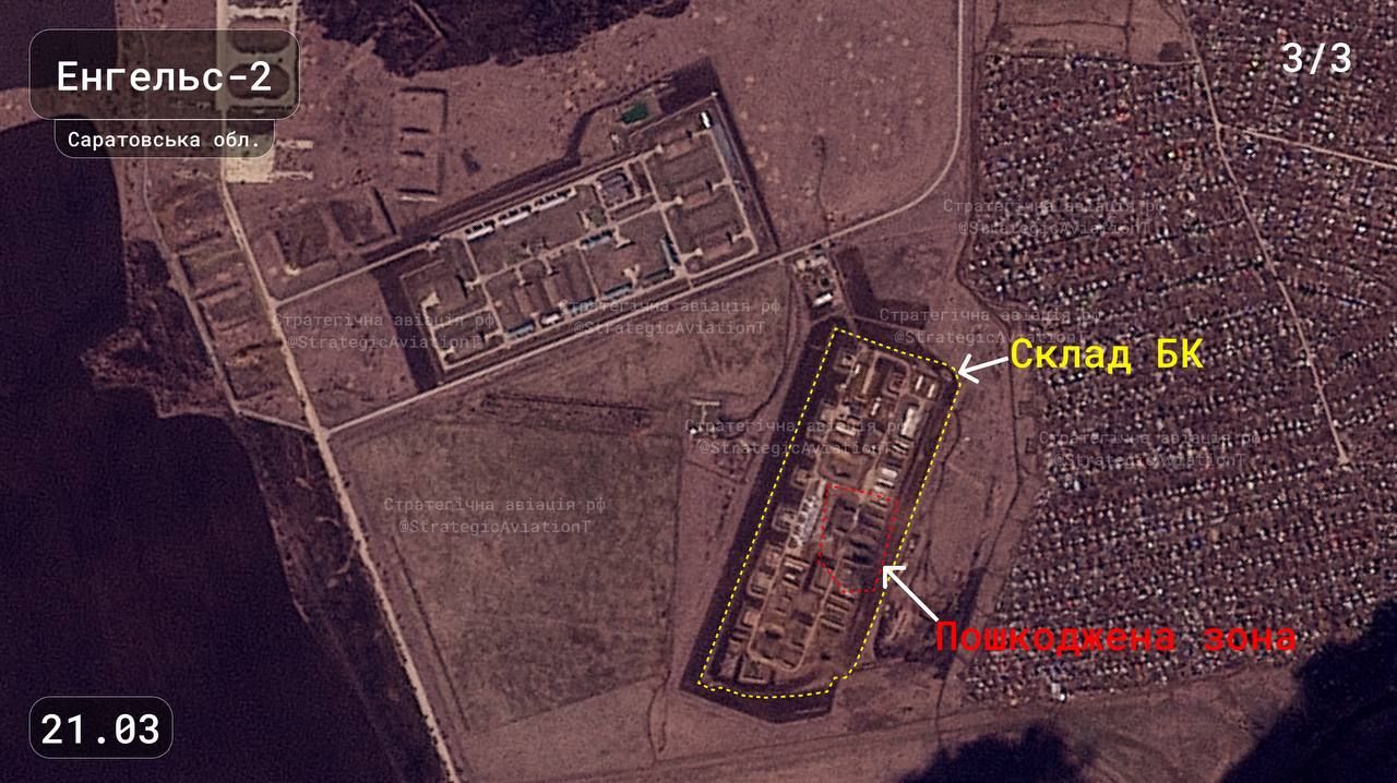На супутникових знімках 21 березня там помітні пошкодження складів боєприпасів. Також на місці деяких будівель з'явилися вирви від вибухів.