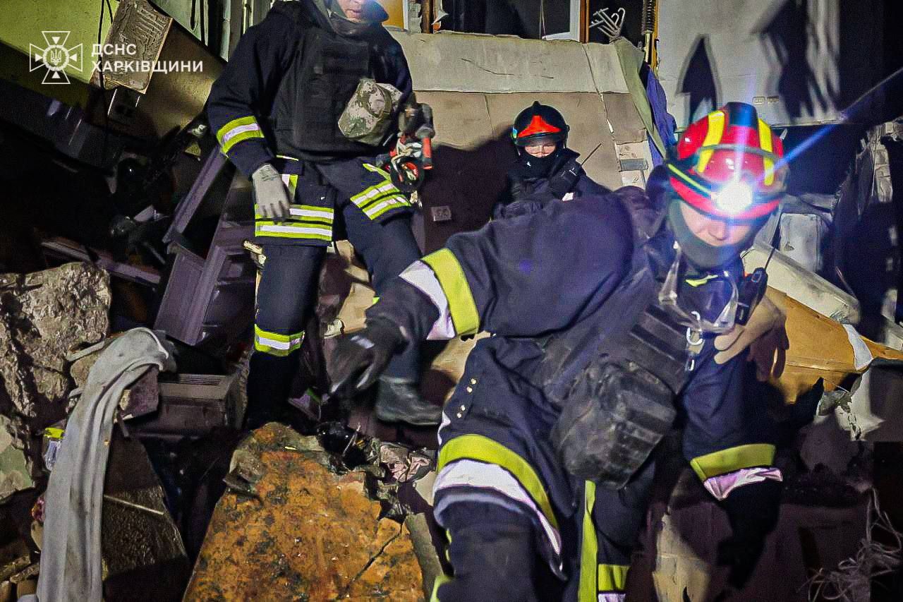 Вказується, що на Салтівці зафіксовано влучання у багатоповерхівку. Там рятувальники продовжують розбирати завали.