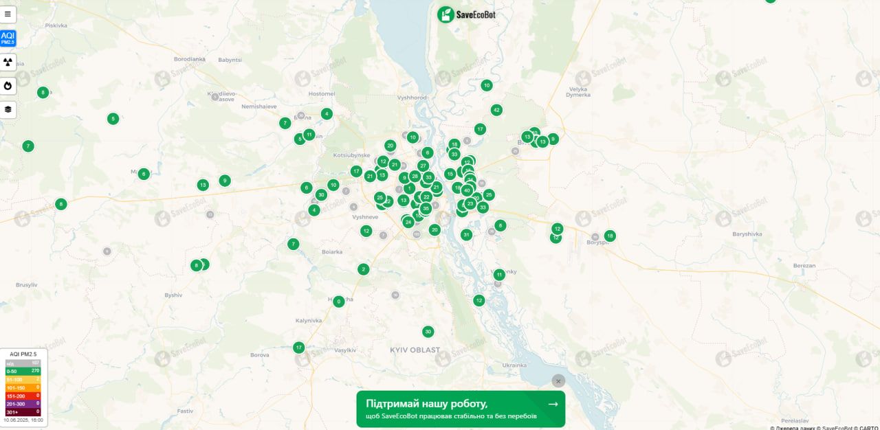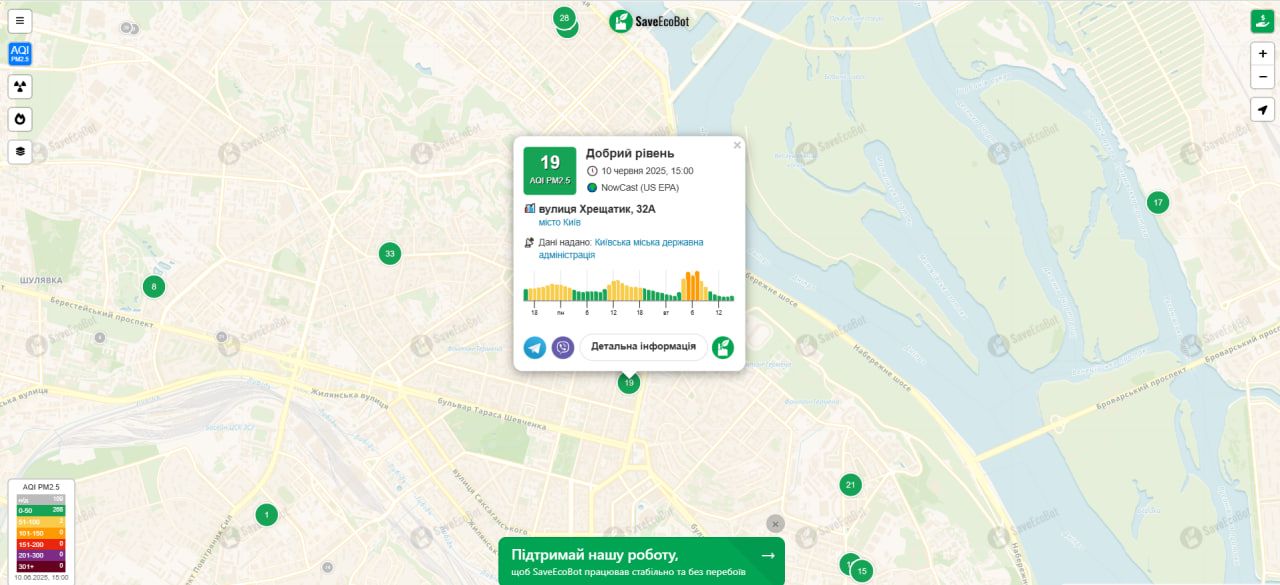 Відповідно до даних SaveEcoBot, на 16:00 10 червня індекс якості атмосферного повітря дорівнює 17. Це добрий рівень забруднення атмосферного повітря, який має мінімальний вплив на здоров'я людей.