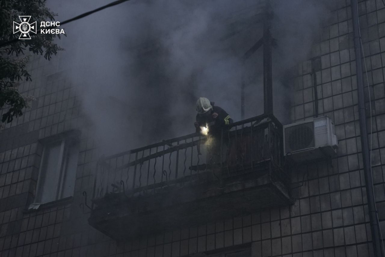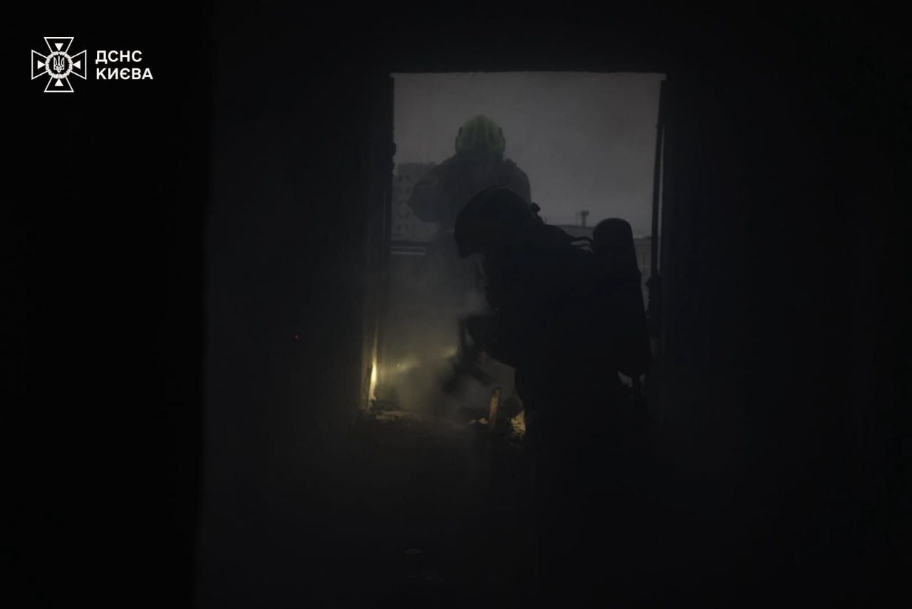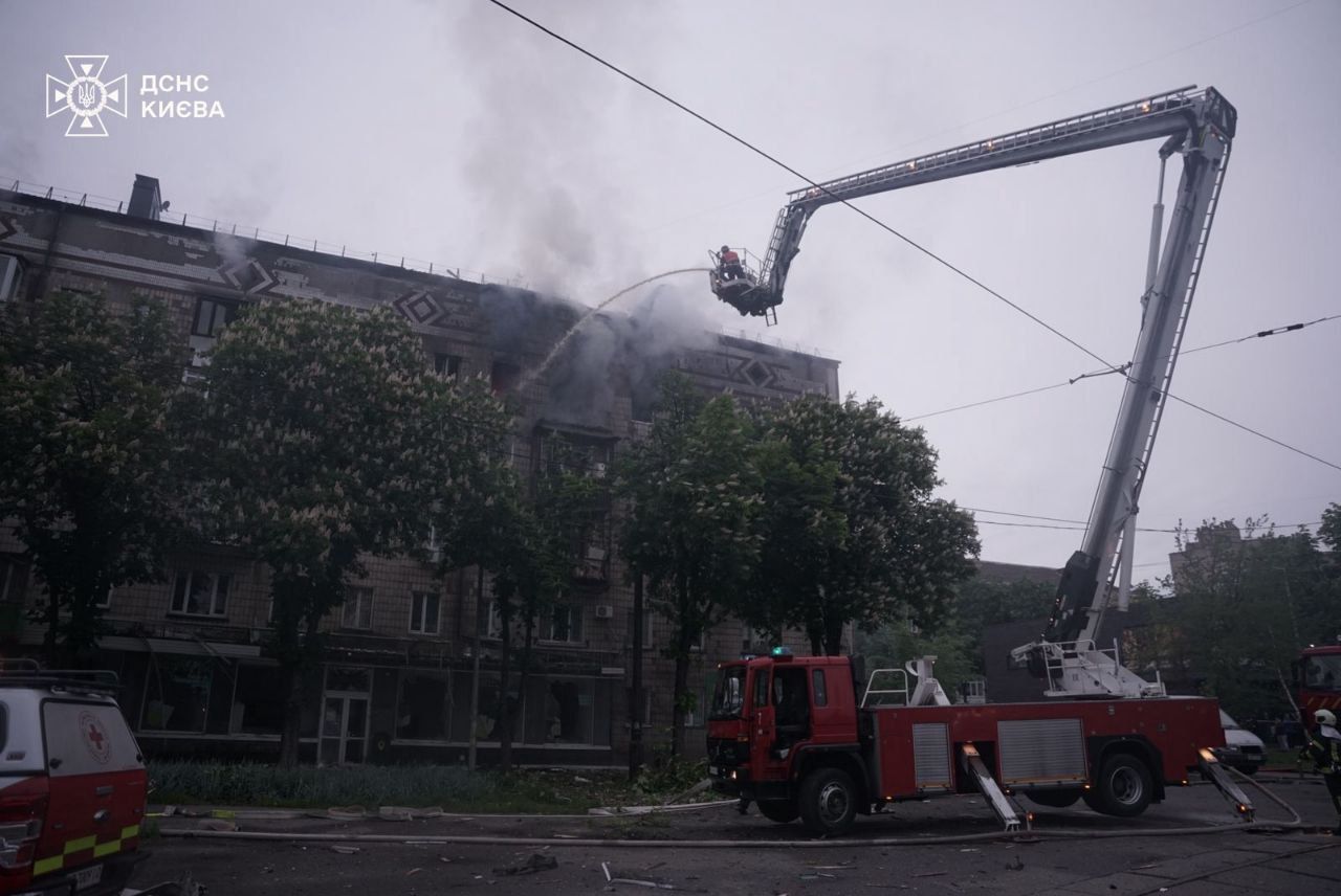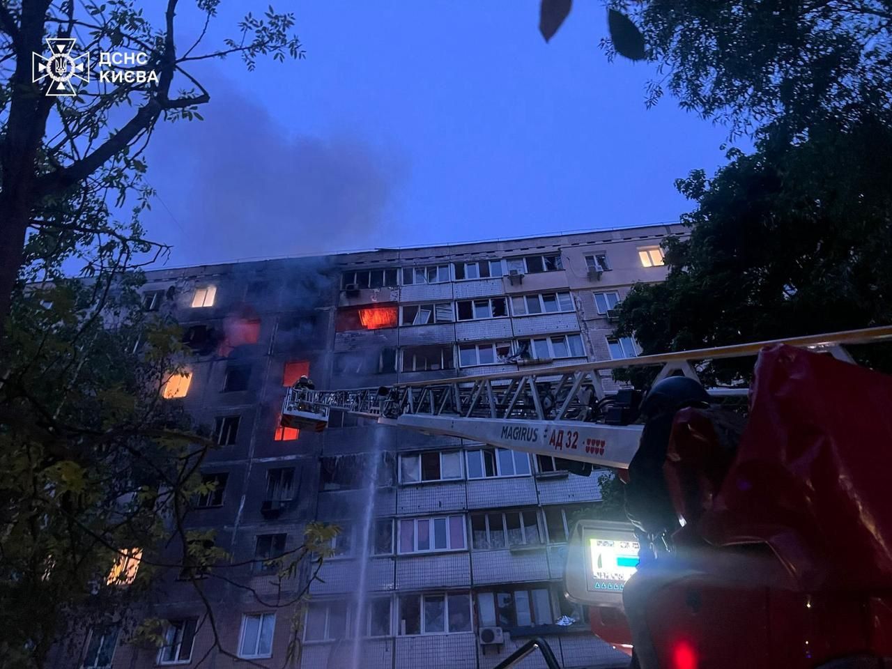 У Шевченківському районі Києва унаслідок падіння уламків БпЛА сталася пожежа у п'ятиповерховому житловому будинку. Вогонь охопив квартири з 3 по 5 поверхи.