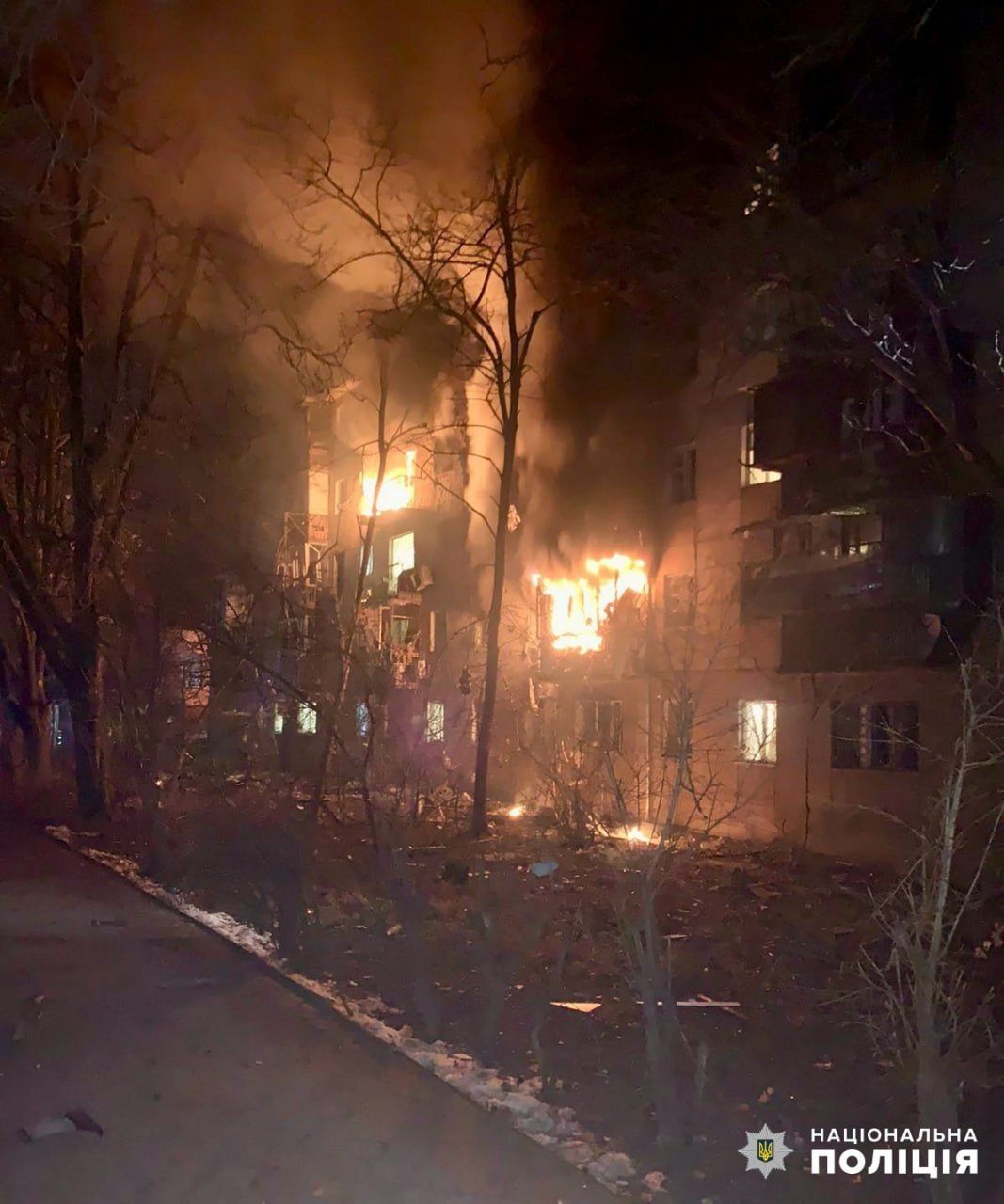 - У ДСНС повідомили, що внаслідок атаки "Шахедами" спалахнула газова труба, 4-х припаркованих легкових автомобілі, балкони на 3-му та 4-му поверхах і квартири на 2-му поверсі п'ятиповерхового житлового будинку на загальній площі 50 метрів квадратних.