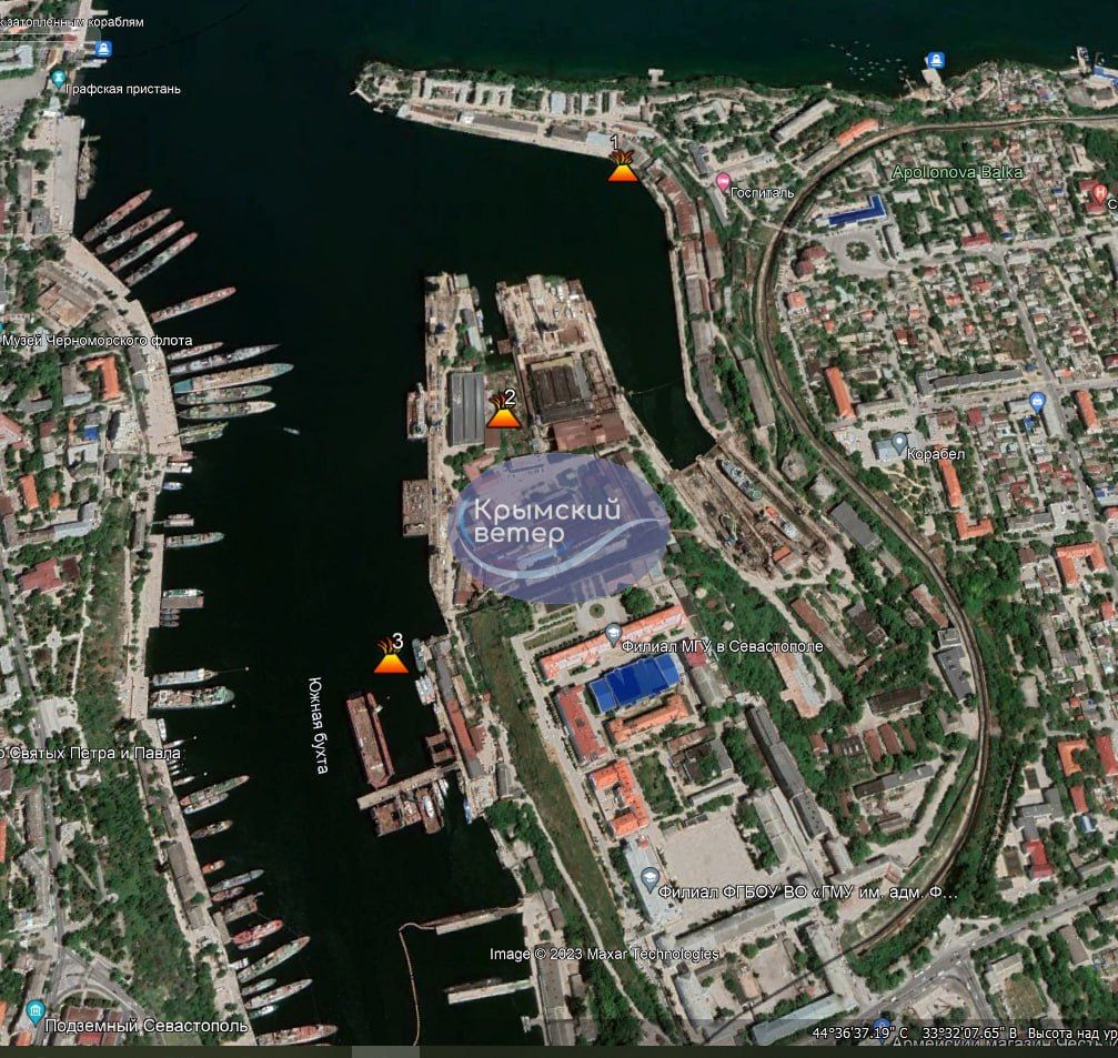 При цьому місцеві телеграм-канали зазначають, що всі три осередки пожеж після удару знаходяться на території морського заводу у Севастополі. Два з них – у Південній бухті, ще один – у Корабельній бухті.