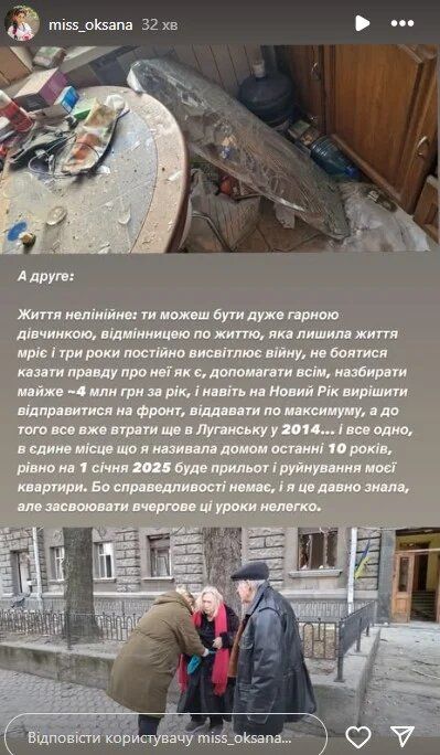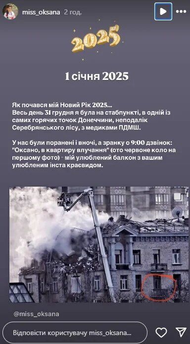 Що я відчуваю? Дві емоції. Великий сюр: я зараз на Донбасі, в пекельній точці, свідомо готова ризикувати, щоб показати більше реалій на фронті. Водночас сьогодні вийшло так, що я в більшій безпеці тут, ніж в самому центрі Києва…Життя нелінійне: ти можеш бути дуже гарною дівчинкою, відмінницею по життю, яка лишила своє життя мрії й три роки постійно висвітлює війну, не боятися казати правду про неї як є, допомагати всім, назбирати майже 4 млн грн за рік, і навіть на Новий Рік вирішити відправитися на фронт, віддавати по максимуму, а до того все вже втратити ще в Луганську у 2014… і все одно, в єдине місце що я називала домом останні 10 років, рівно на 1 січня 2025 буде прильот і руйнування моєї квартири,