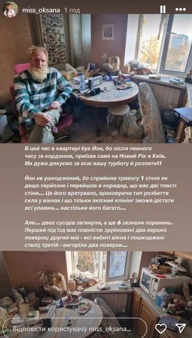 Квартиру воєнної фотографині Оксани Йоханнессон пошкодили уламки дронів, які впали в Києві вночі проти 1 січня. Про це пише 24 Канал із посиланням на її повідомлення.