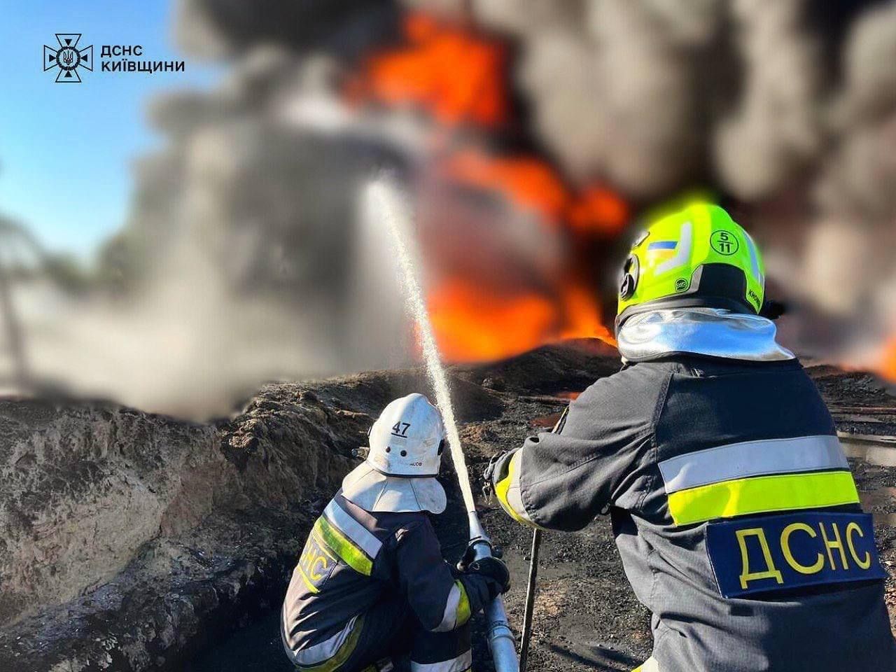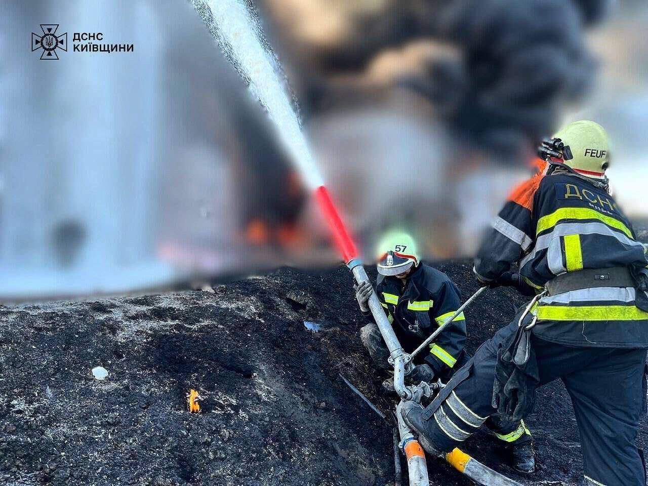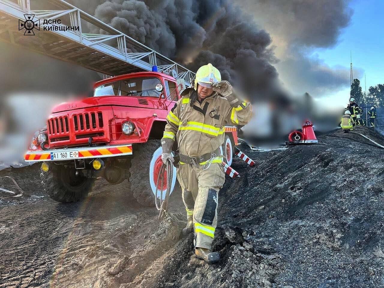 Повідомлення від Київської ОВА було близько 5 ранку, зараз вже 10 і досі йде ліквідація. Гасять пожежу близько сотні рятувальників і понад 20 одиниць автомобільної техніки, використовують роботизовану техніку. Пригнали спеціальний пожежний поїзд, щоб пришвидшити гасіння,