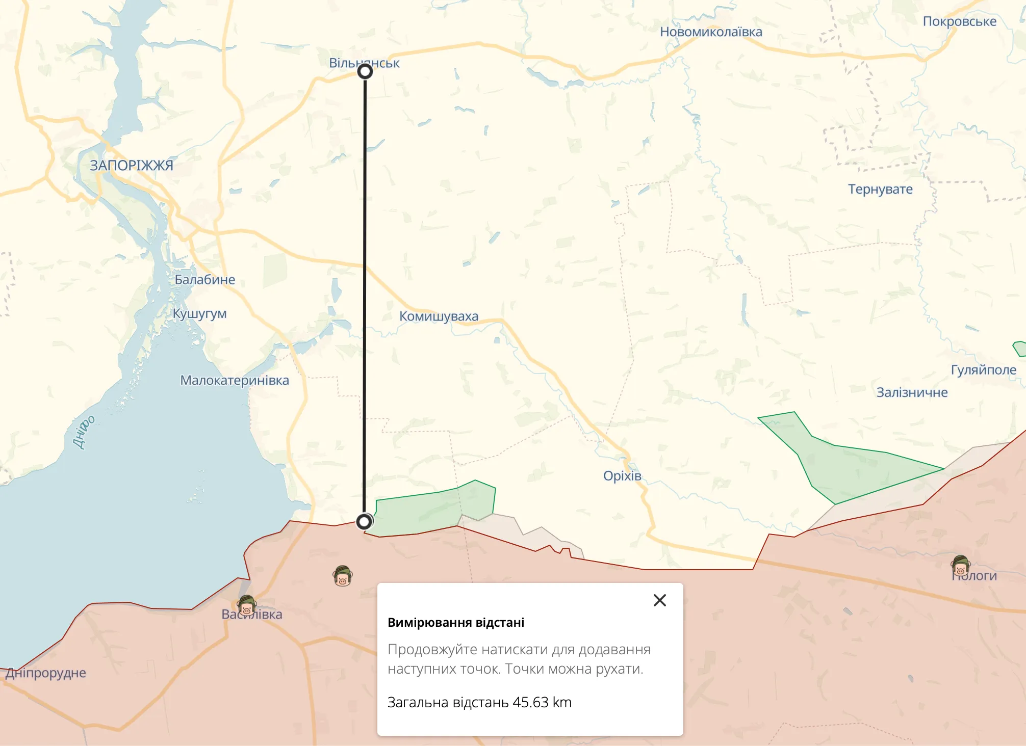 Вільнянськ за менш як 50 кілометрів від окупованої частини Запоріжжя / Скриншот deepstate
