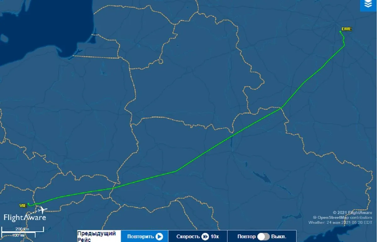 За даними Flightradar, авіалайнер Austrian Airlines приземлився в московському аеропорту Домодєдово на 12 хвилин раніше. А свій рейс з Відня він виконав за зміненим маршрутом – через Україну. Хоча досі він пролягав через повітряний простір Білорусі.