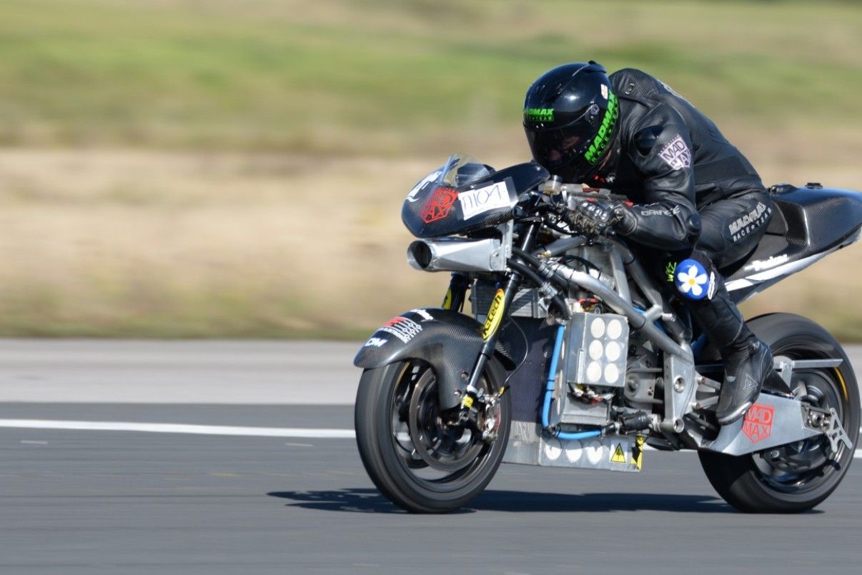 Зеф Айзенберг розігнав електробайк на аеродромі Елвінгтон в Йорку до рекордної пікової швидкості в 317 кілометрів на годину.