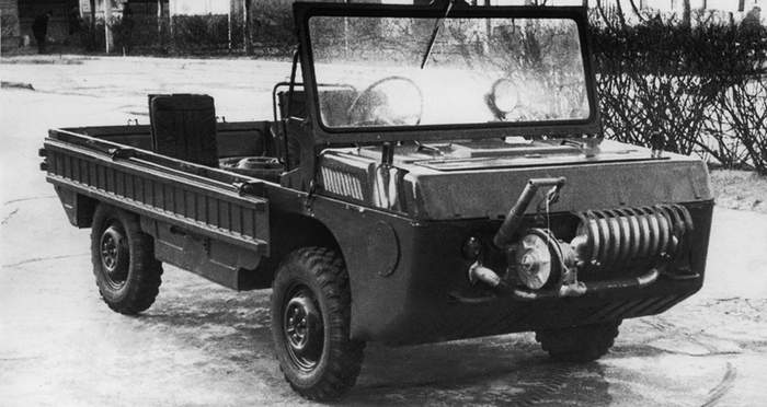Поки на МЗМА експериментували з візками на шасі “Москвичів”, у дослідному інституті НАМІ почали свій проєкт транспортера переднього краю – з розумінням того, що машину треба зробити поменше. Концепція була в цілому та сама, але створювали її на рівному місці, не беручи за основу якусь існуючу платформи. Для більшої компактності амфібії її обладнали двоциліндровим опозитником від важкого мотоцикла, який встановили спереду.
