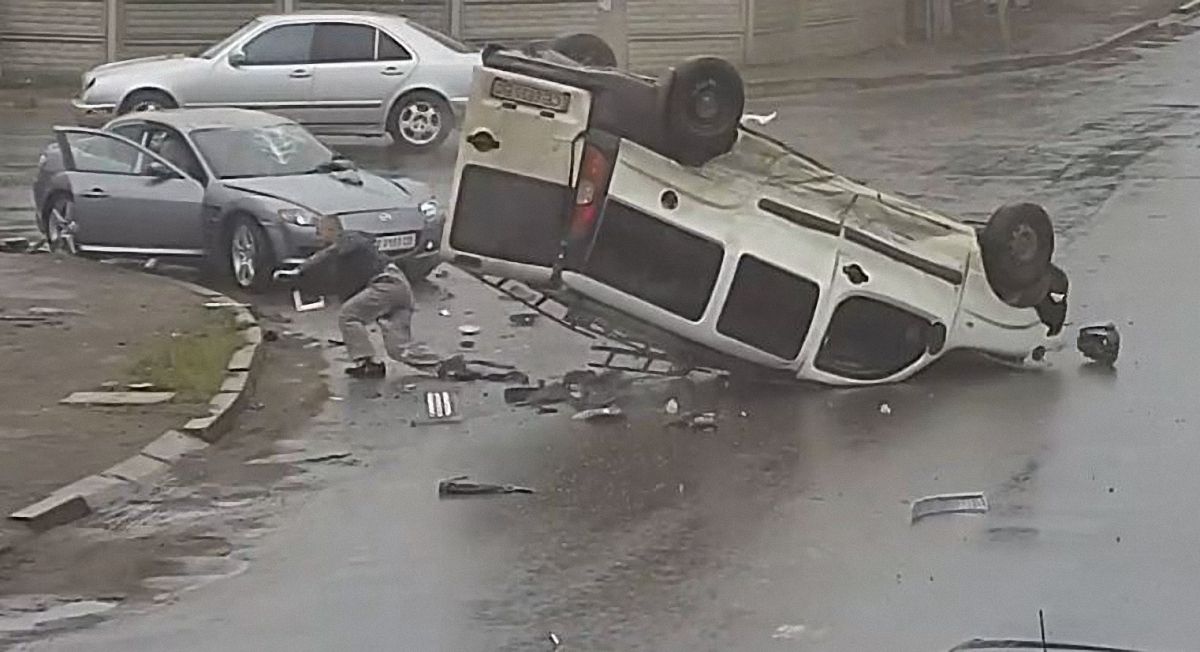 Автомобіль Fiat Doblo вирішив проскочити на жовтий сигнал світлофору, а водій Mercrdes-Benz також на жовтий вже виїхав на перехрестя. Прямо на перехресті сталося зіткнення. "Мерс" вдарив "Фіат" в бік, в результаті чого фургончик врізається в Mazda RX-8. Від удару Fiat перевертається та приземляється на дах. Не дивлячись на це, з пасажирського сидіння фургончика спритно виліз пасажир, а через декілька секунд – і водій "Фіату".