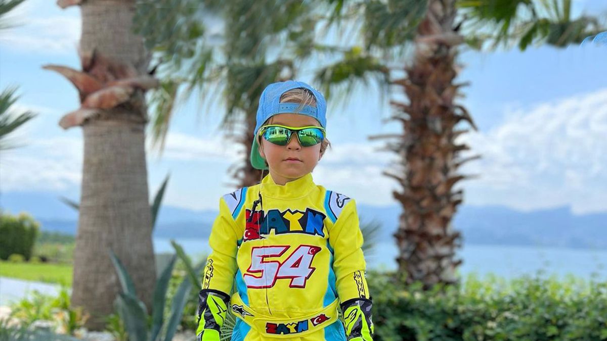 Зейн має пошиту під його зріст форму - персоналізований перегоновий комбінезон, черевики, рукавички та шолом у жовто-блакитних тонах. Можливо, батьки підтримують Україну?