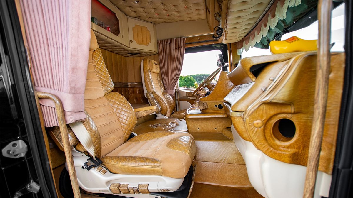 А всередині розкоші немає меж. Звісно, золотом та діамантами тут нічого не оздоблено, але шкіри та натуральних матеріалів вистачає. Важко не звернути увагу на унікальну оббивку, ром-бар, розміщений під стелею, і красиво розписані деталі, від перемикачів до ключа блокування тахографа.