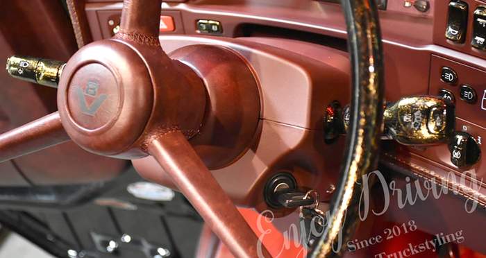 Численні емблеми виробника можна побачити повсюди, як от знамениті вісімки та літера V, що позначають восьмициліндрові V-подібні двигуни: родина Бегетто вже майже півстоліття їздить на Scania V8. Тут також помітні величезні бичачі роги – натяк на те, що все почалося з перевезення тварин.