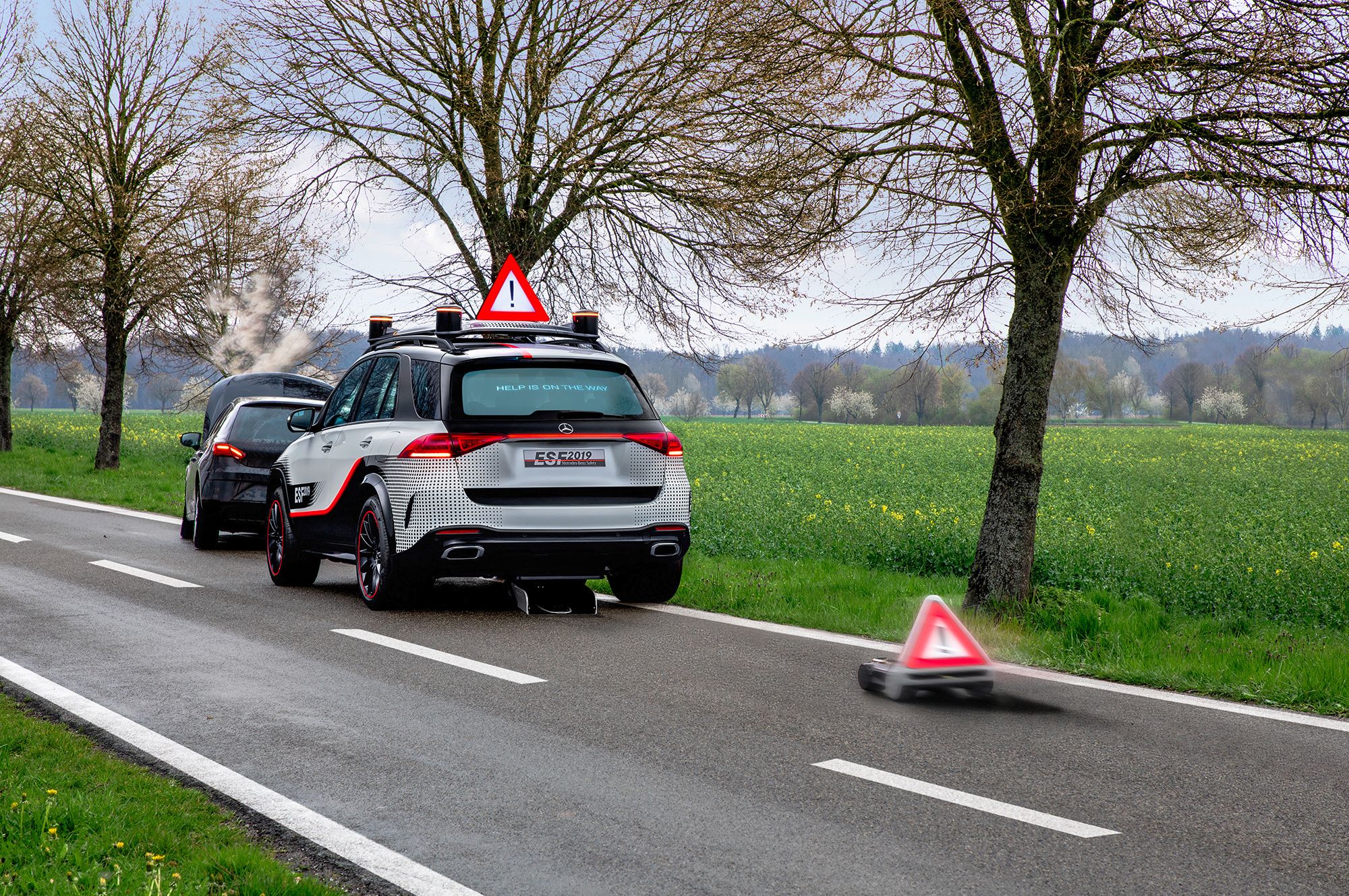 Якщо безпілотник потрапить в ДТП, Mercedes GLE ESF сам виставить на дорогу знак аварійної зупинки, використовуючи для цього маленького робота. Ще один знак “аварійки” підніметься на даху, а заднє скло перетвориться на інформаційне табло з попередженням для інших учасників руху. Далі автомобіль відправить сигнал з повідомленням про аварію і її місце у відповідну службу.