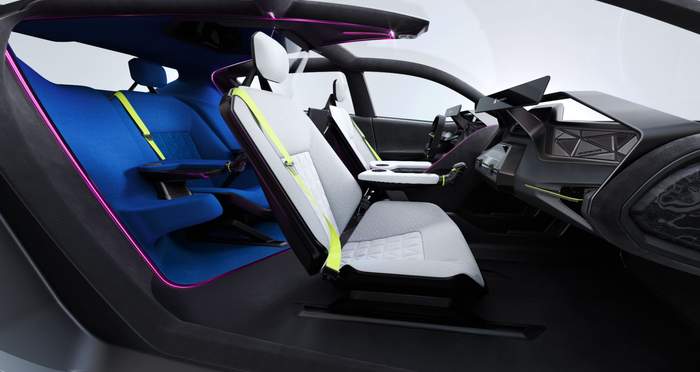 Що стосується інтер’єру, то він створювався з прицілом на служби таксі, а тому ззаду є місце лише для одного пасажира. Передні крісла максимально відсунуті один від одного для зручності користування джойстиками. Перед кожним пасажиром є видовжений екран з основними даними про поїздку. Кермо в режимі дистанційного керування ховається у передню панель.