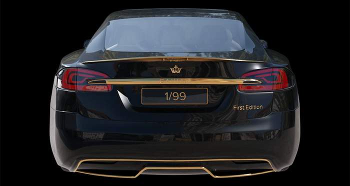 Золото було нанесено на решітку радіатора, деталі бампера, кришки бічних дзеркал, крила, двері, задній дифузор, кришку багажника, колеса та гальмівні диски за “технікою подвійного гальванічного покриття”. Золотий декор контрастує з чорним кузов електричного седана. Caviar також замінив оригінальні шильдики електрокара масивними коронами свого логотипу.