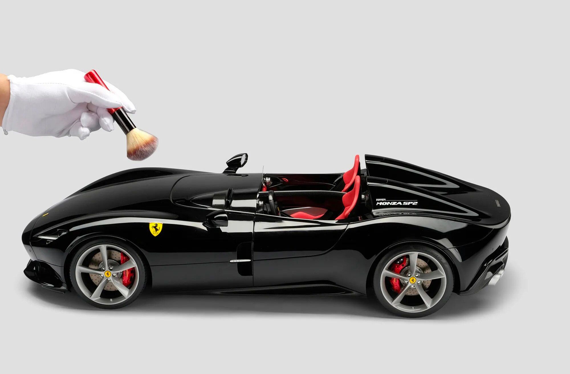 Кнопки на кермі, паски безпеки, двері, що відкриваються вгору, навіть інтер’єр оздоблений справжніми матеріалами в кольорі Rosso Corsa від оригінального Ferrari Monza SP2. Модель встановлена на постаменті з вуглеволокна, закрита пилонепроникною акриловою кришкою. Кожна модель постачається з нумерованим сертифікатом справжності, який зберігається у шкіряному футлярі.