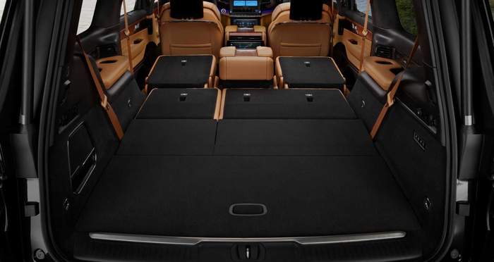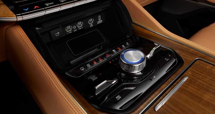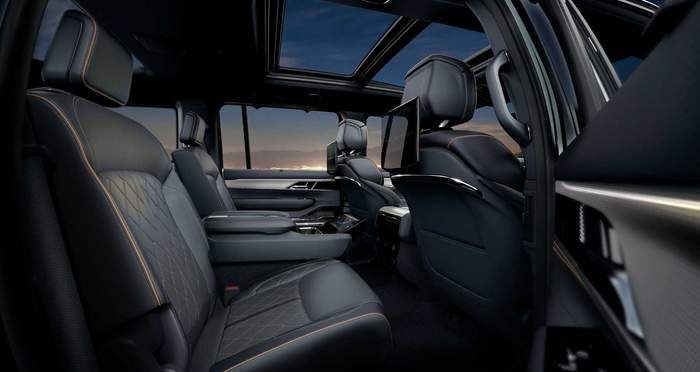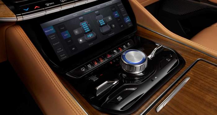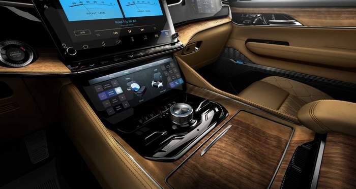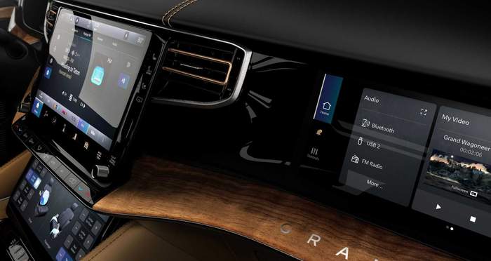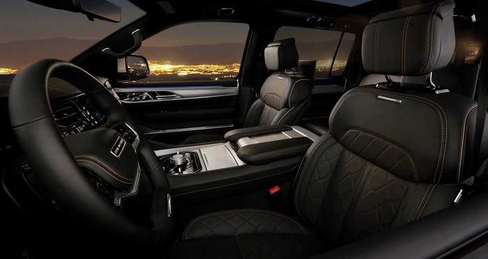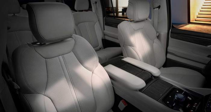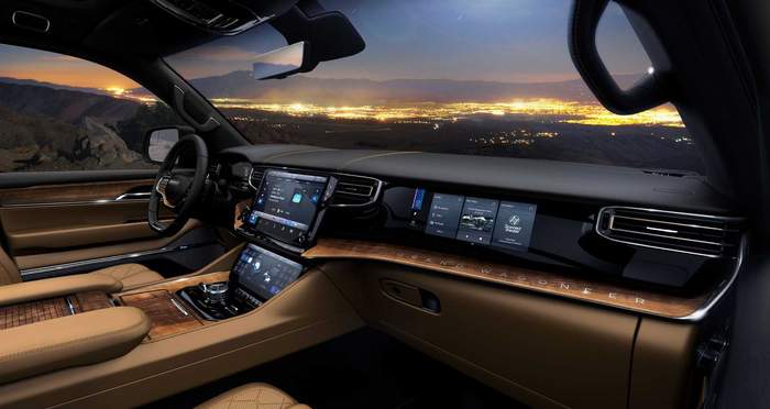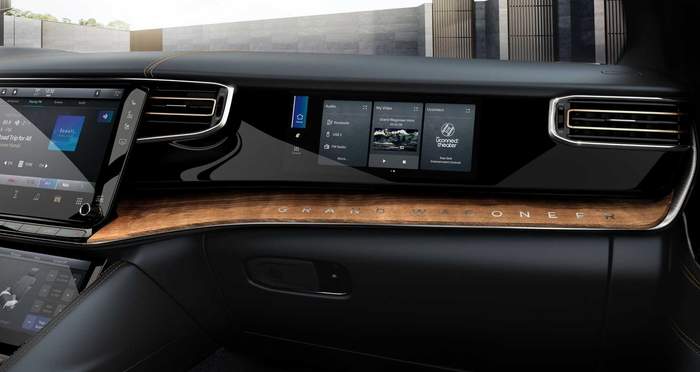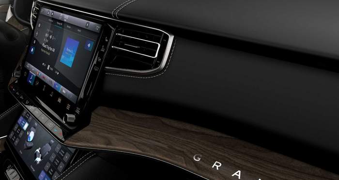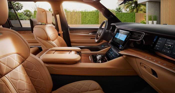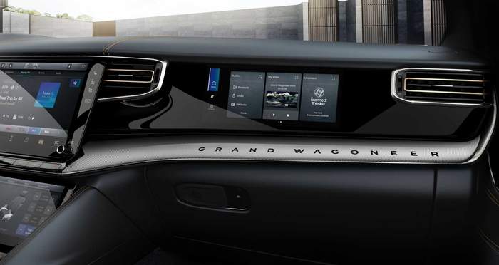 Grand Wagoneer всередині щедро оздоблений натуральнм деревом, алюмінєм та вишуканою шкірою. Топова версія пропонує акустичну систему з 23 динаміками та 1950-ватним підсилювачем.