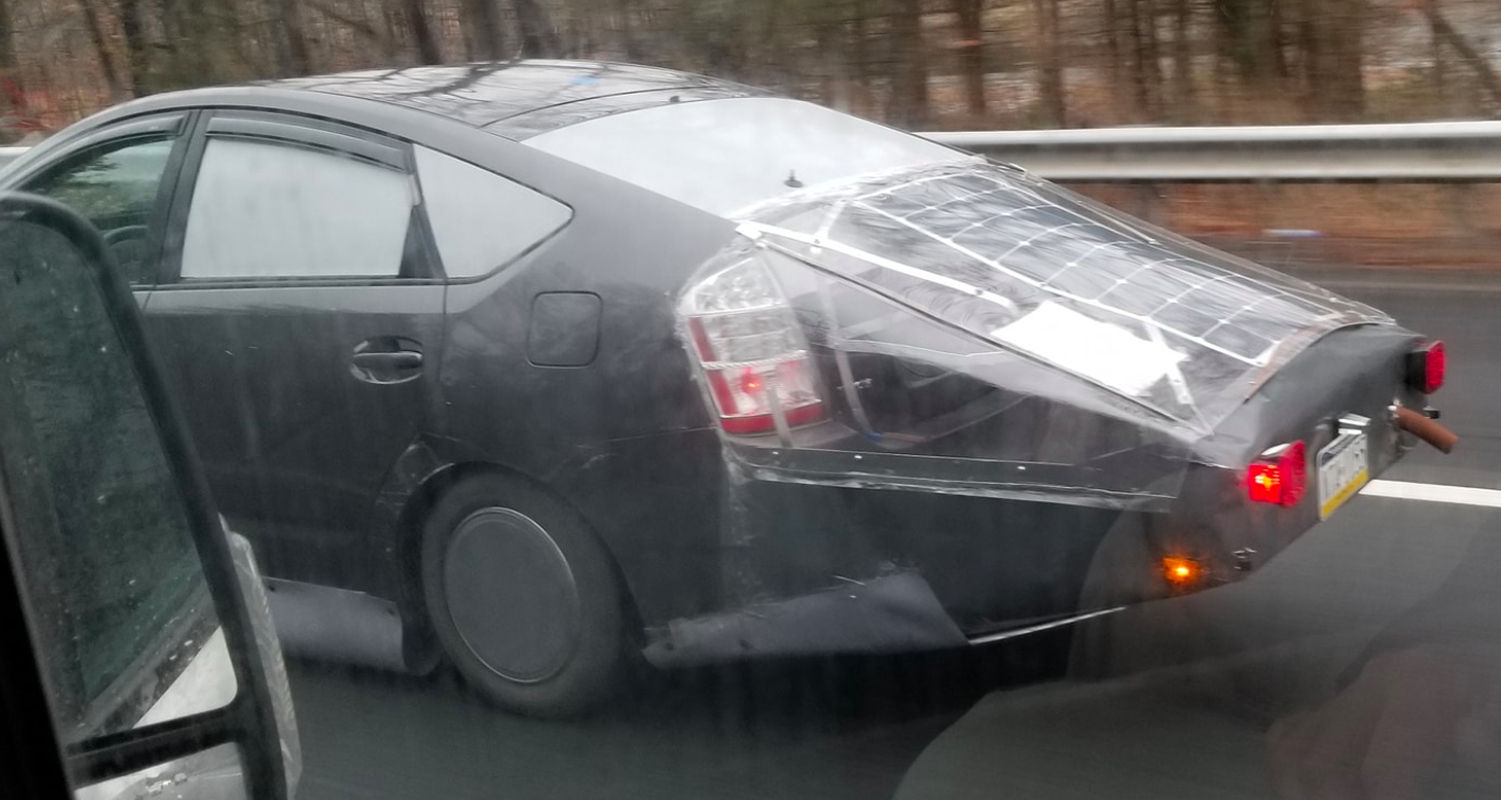 Можливо перед нами дипломна робота студента Массачуссетського технологічного університету з паливної ефективності – фотографія була зроблена на автомагістралі Interstate 95 в Массачусетсі. Або вправний автомеханік вирішив полагодити поламаний гібрид і перетворив його на електрокар з сонячними панелями. На жаль, автор знімка не дізнався, кому належить чудернацький синій солар-Пріус.