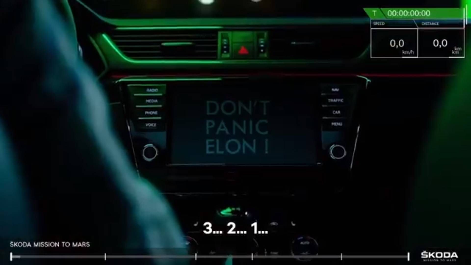 Навідміну від Tesla Roadster, Skoda Superb – пілотований корабель. Пілот, у скафандрі, схожому на той, що одягнуто на манекен у родстері, самостійно готує автомобіль до старту. Шкодівський Starman, заводить 2-літровий бензиновий двигун. На дисплеї мультимедійної системи з’являється напис: “Не панікуй, Ілоне!”. Автомобіль рушає в путь. Завдяки 280-сильному двигуну та вправності пілота, ліфтбек досить швидко потрапляє з точки відправки до невеличкого містечка у Франції під назвою Марс. Місцеві жителі – тобто марсіани, радо вітають прибульця.