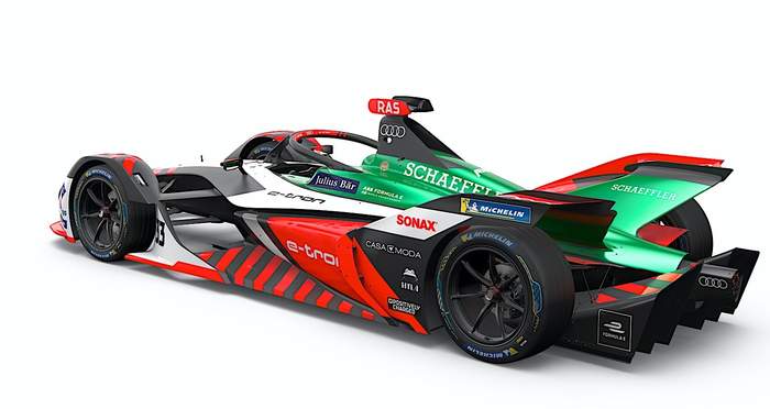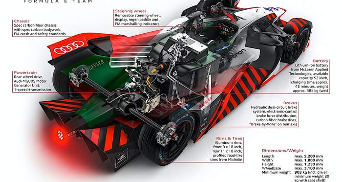Електричний болід німецької марки оснащений абсолютно новим силовим агрегатом, який був розроблений власними силами Audi. Він складається з одношвидкісної трансмісії з концепцією внутрішнього ротора, зовнішніми магнітами, системою охолодження та шістьма електричними фазами.