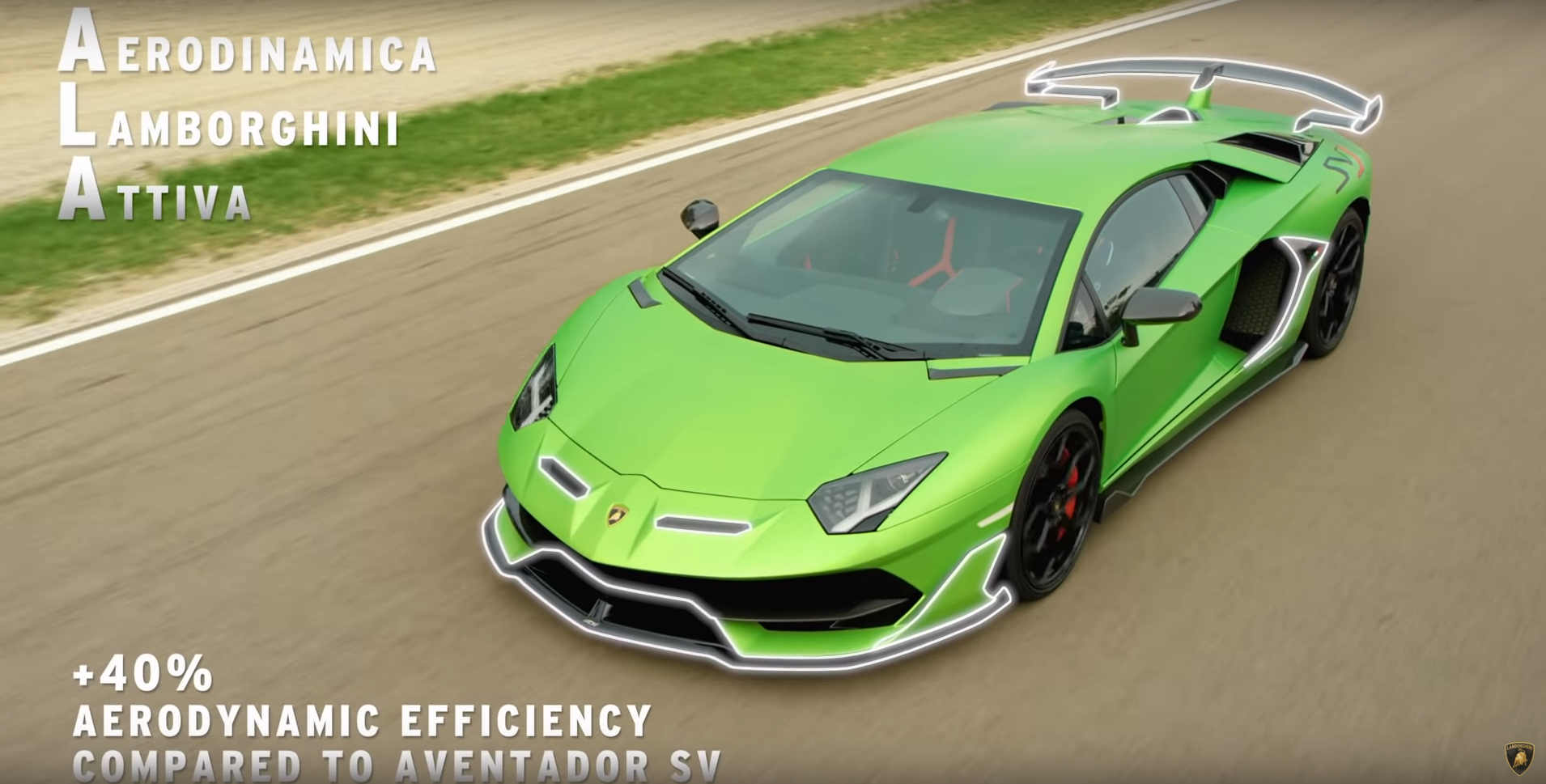 ALA – Aerodinamica Lamborghini Attiva – це інноваційна система активної аеродинаміки, яка адаптує суперкар до стилю водіння і до особливостей траєкторії та, залежно від ситуації, збільшує вертикальне навантаження для підвищення стабільності та швидкості проходження поворотів або зменшує аэродинамічний опір, сприяючи розгону і досягненню максимальної швидкості. Завдяки потужному мотору та оптимізованій аеродинаміці Aventador SVJ набирає першу сотню за 2,8 секунди.