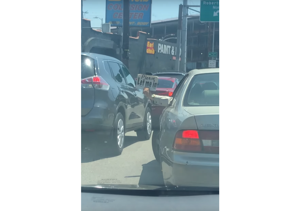 На першій табличці написано “Please, let me in”, тобто “Пропустіть мене”. З нею водій вклинюється в сусідній ряд, а виконавши маневр, дістає іншу картонку з написом “Дякую!”.
