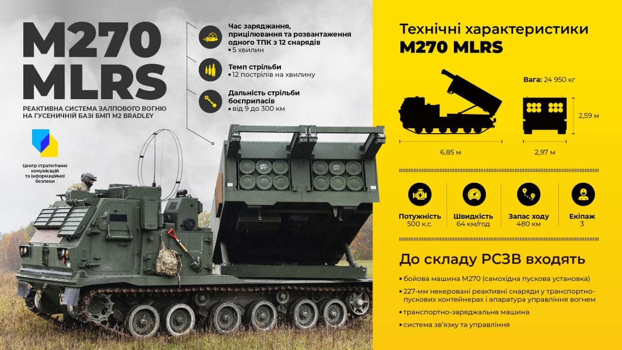 Система MLRS (англ. Multiple Launch Rocket System) М270 на гусеничній базі БМП «Бредлі», має два окремих пускових контейнери та відповідно до компоновки ракет – різну їх кількість, дальність та спроможності ураження ворога. Кожен контейнер може бути споряджений шістьма або однією ракетою. Така РСЗВ є універсальною у використанні.