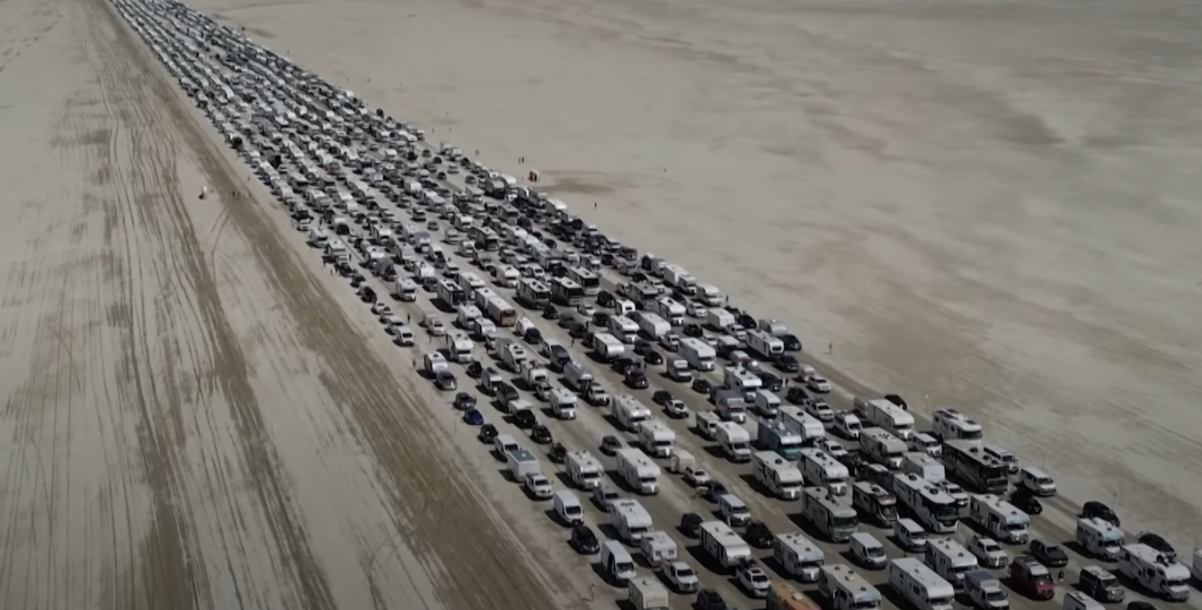 Дрон сделал видео огромной пробки, которая протянулась на выезд с места празднования ежегодного фестиваля Burning Man. В последние дни события в пустыне Невады прошел сильный ливень, поэтому дороги размыло.