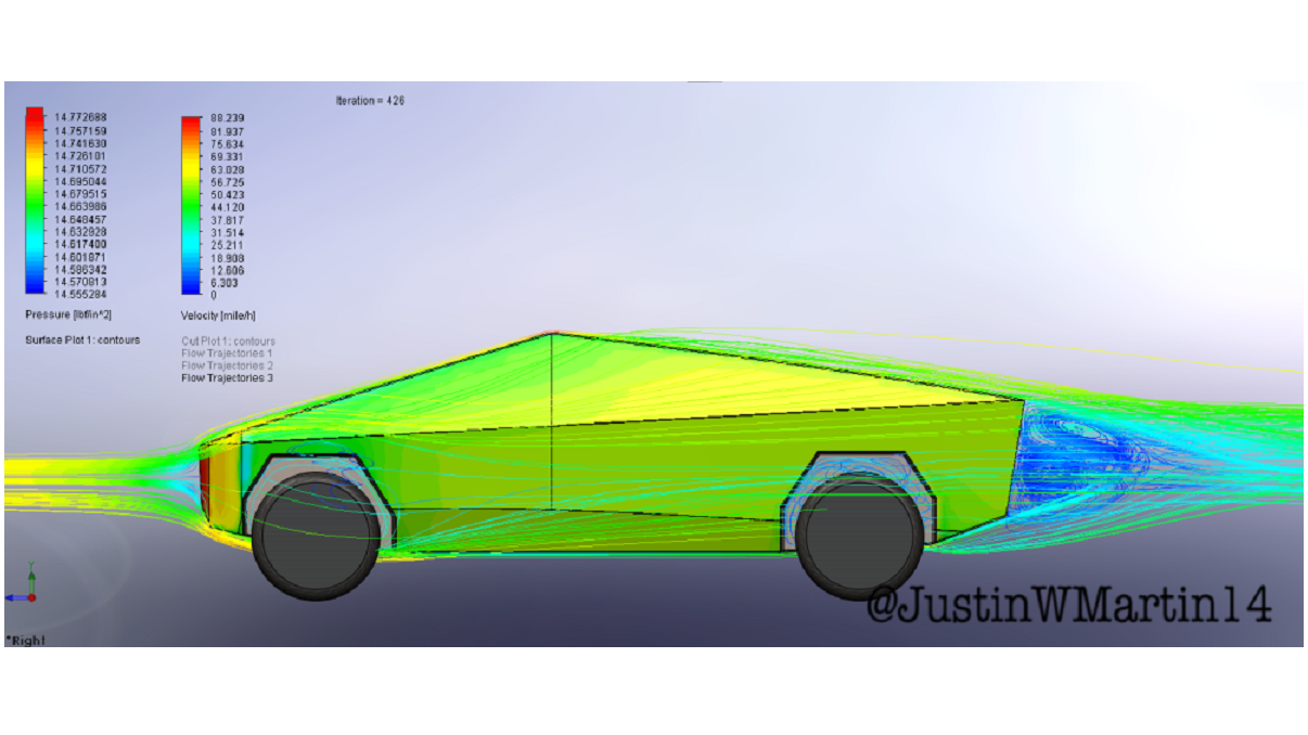 Результат, полученный Мартином, не является 100-процентно точным, поскольку виртуальную модель электрического пикапа он создавал на основе доступных фотографий. Он признается, что все еще сомневается, относительно соответствия дизайна колес и крыльев своей 3D-модели Tesla Cybertruck, из-за чего не берется называть выведенный коэффициент аэродинамического сопротивления, однако полученные результаты позволяют сделать определенные выводы.