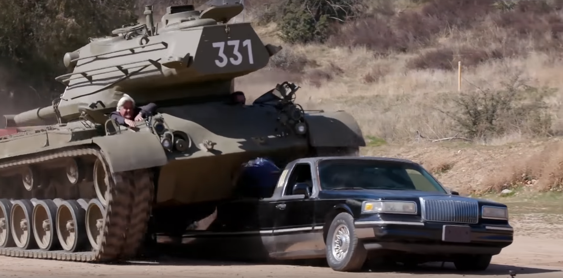 На своем танке бывший губернатор Калифорнии и вечный Терминатор приехал к другому страстному автолюбителя – Джею Лено. На такой боевой машине Шварценеггер ездил, когда служил в армии, а позже, уже став известным, отыскал списанную машину и приобрел ее для своей коллекции. В эфире телешоу Make it ребята как следует развлеклись и с 50-тонным танком М47, и с легким броневиком Джея Лено. А "на закуску" Арнольд Шварценеггер, как и полагается Терминатору, эффектно разбил на танке легковую машину.