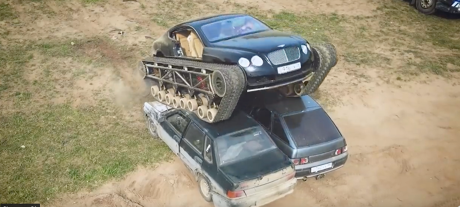 Необычный автомобиль, созданный с кузова Bentley Continental GT и гусеничного шасси от легкого танка, вывели на испытания. В первом видео он просто ездил по грунтовым дорогам, а в этот раз – крушил автомобили. На видео блогер наезжает на старые "Лады" и давит их. Машина с клиренсом 59 см и на гусеничном ходу делает это с легкостью. Также показан тест на макимальную скорость – с помощью 400-сильного двигателя автомобилю едва удается разогнать до 60 миль/ч (около 100 км/ч).