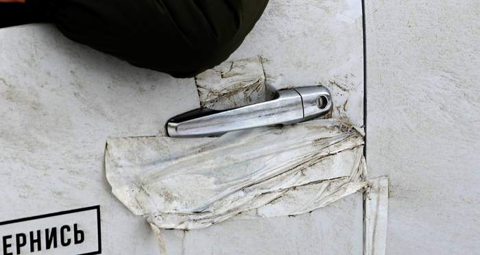 На некоторых фото у дверных ручек со стороны водителя внимание привлекают наложенные аппликации из белых заплат, закрывающих какие-либо повреждения, может, отверстия или надписи. Также пленка есть на некоторых зеркалах заднего вида.