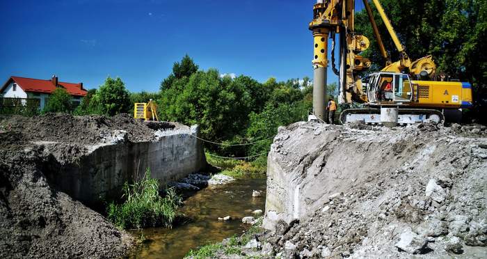 Строители ведут демонтаж старых мостовых конструкций, устраивают на месте будущих искусственных сооружений буронабивные сваи.