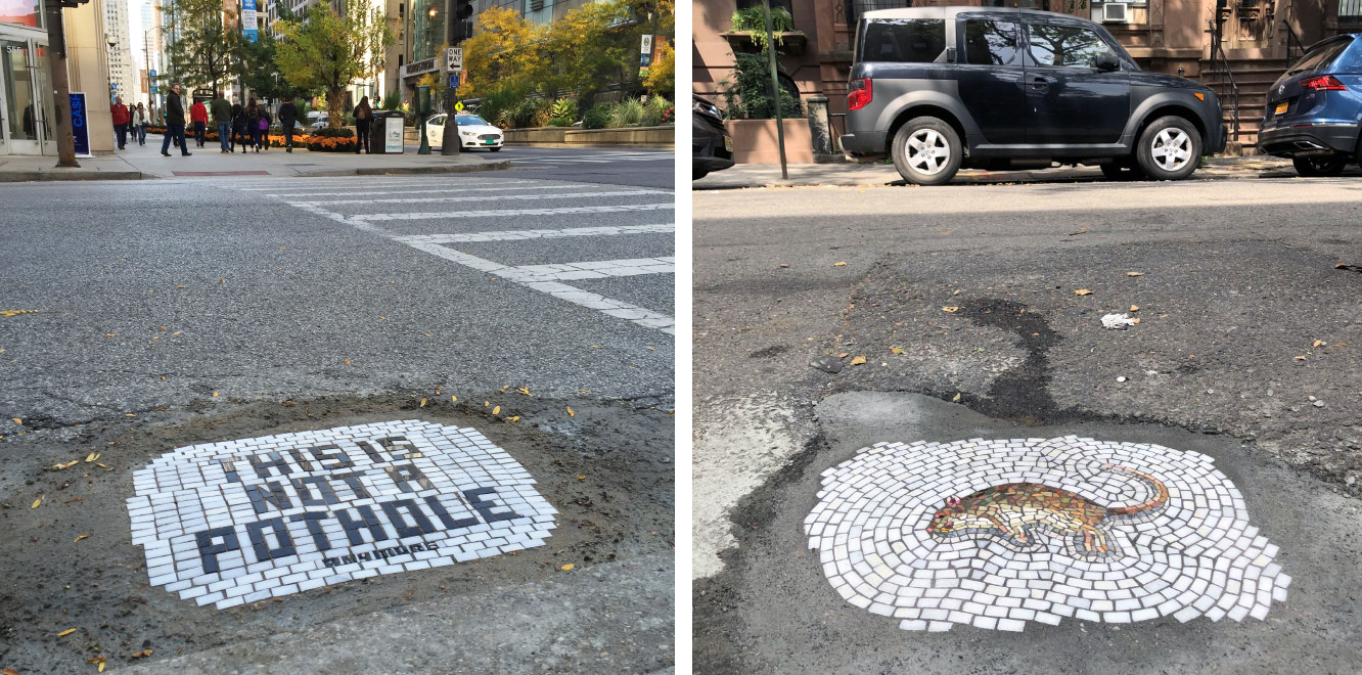 Фото: мозаика в дорожных выбоинах / Instagram, NYTimes