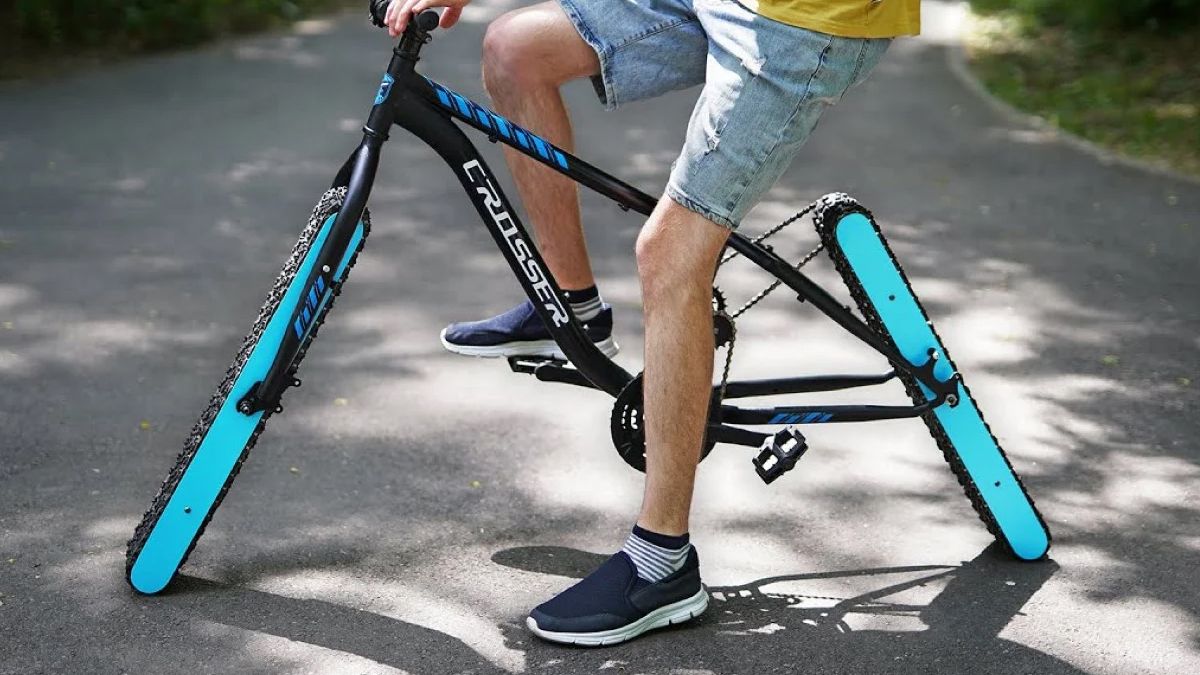 В нынешнем проекте инженер снова бросает вызов классической концепции велосипедной ходовой, заменив проверенные временем круглые колеса со спицами конструкциями пенальной формы с натянутыми снаружи гусеничными лентами.