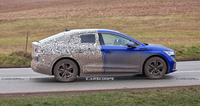 Спереди автомобиль почти не отличается от стандартного Skoda Enyaq iV. У него такие же фары и решетка радиатора, а в дизайне преобладают острые грани. Однако линия крыши более наклонная, а задняя часть заострена.