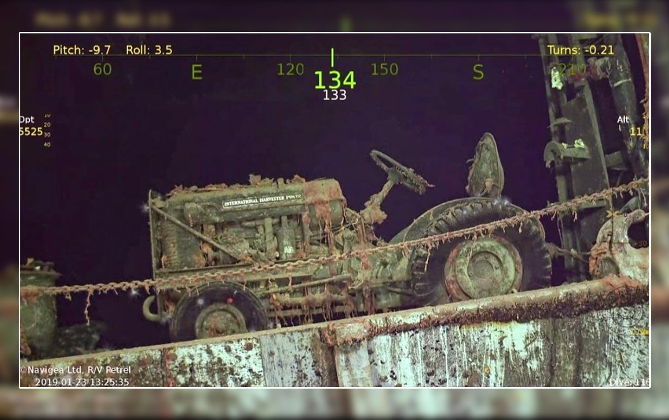Трактор стоит привязанный цепями на палубе затонувшего американского авианосца USS Hornet (CV-8). Как говорится в сообщении historyfeels на Instagram-странице и в ряде других источников, состояние хорошо сохранившегося трактора зафиксировала подводная камера.