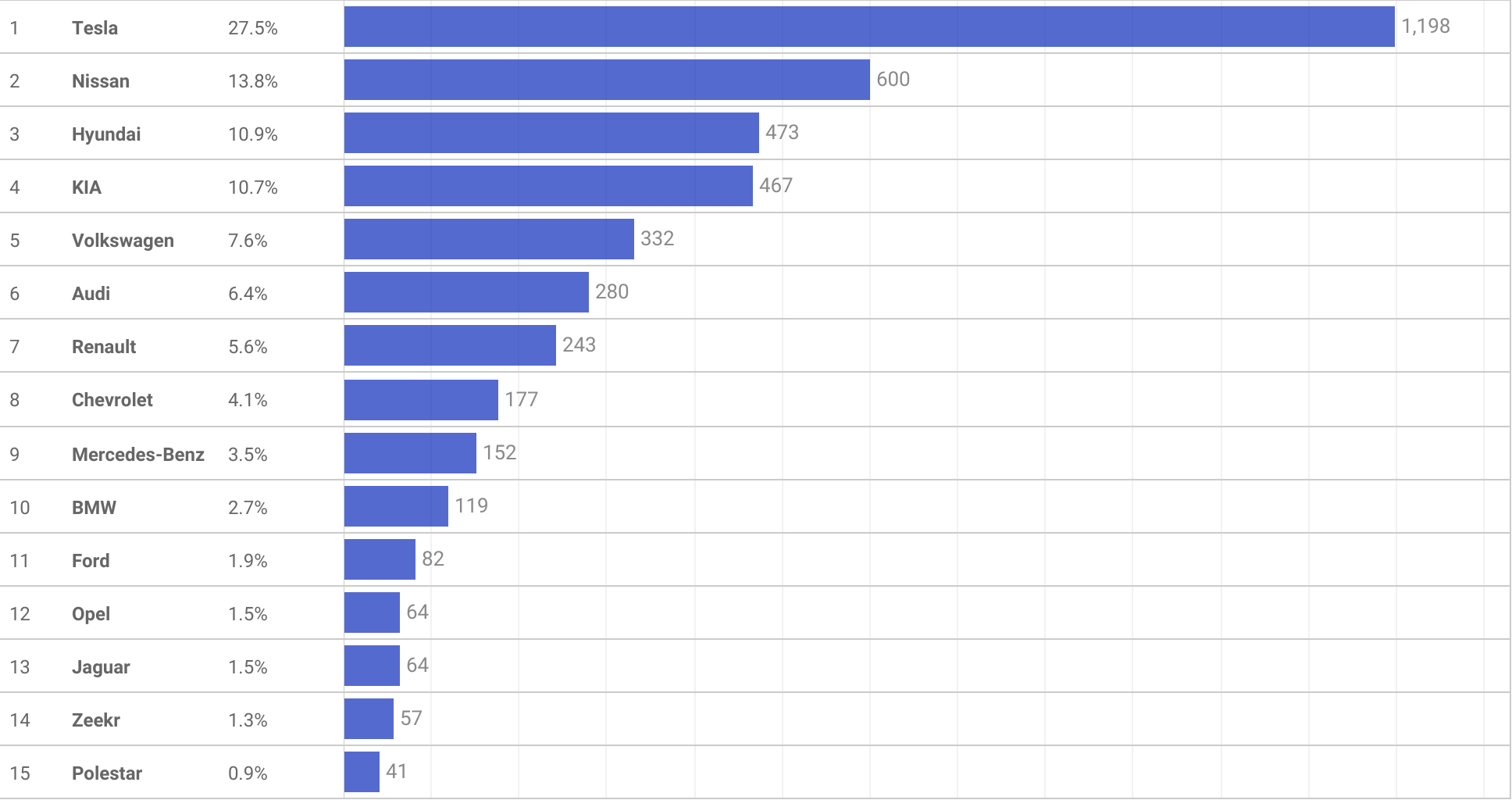 Что чаще покупали в начале этого года? Начнем с производителей, где Tesla уверенно лидирует, как по количеству, так и по доле, и с существенной разницей от Nissan, который на втором месте и долгое время был здесь лидером. Также в тройке лидеров Volkswagen - остальные игроки охватили менее 10% рынка.