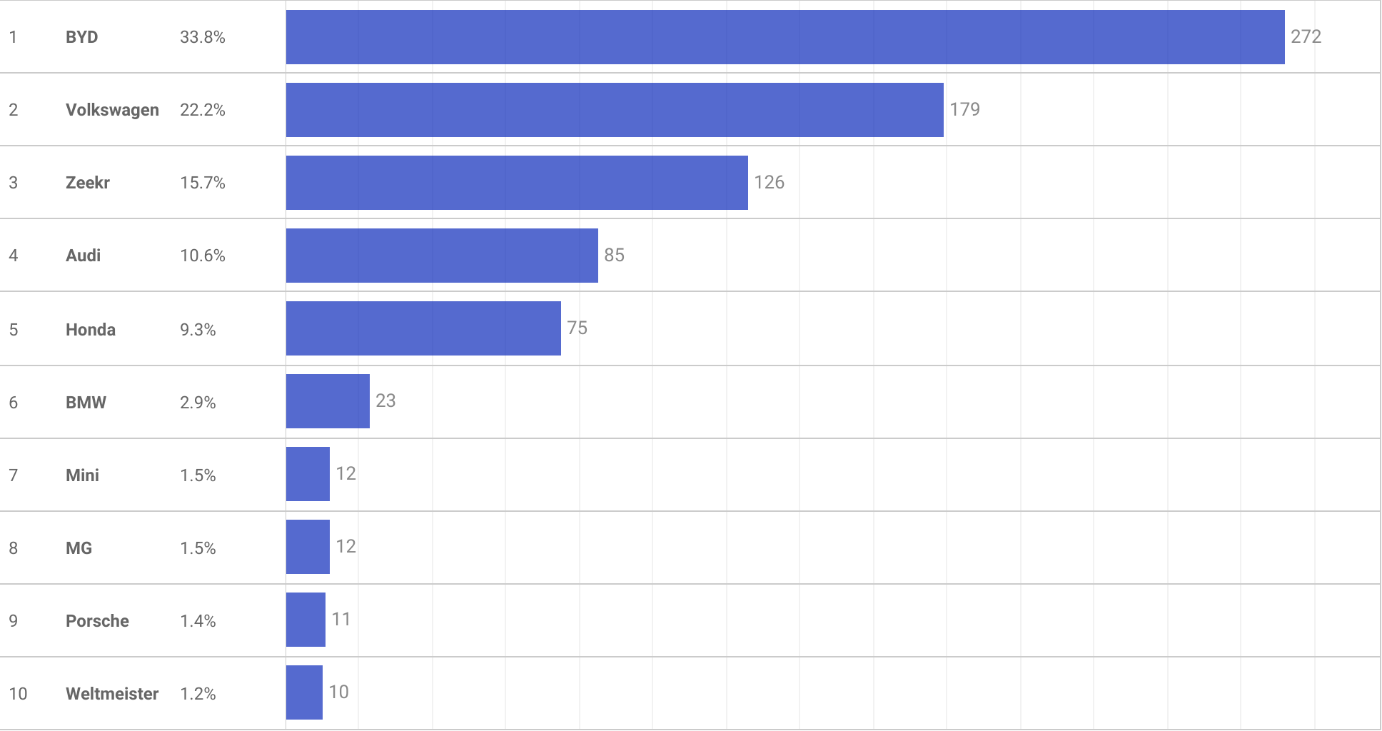 Какие марки новых электромобилей пользовались наибольшим спросом в апреле? Китайский BYD укрепил свою позицию, и не просто укрепил - а захватил более трети всего рынка с долей 33,8%! Второе место за Volkswagen, чья продукция охватила почти четверть всех продаж - 22,2%, третий - Zeekr с долей почти 16%.